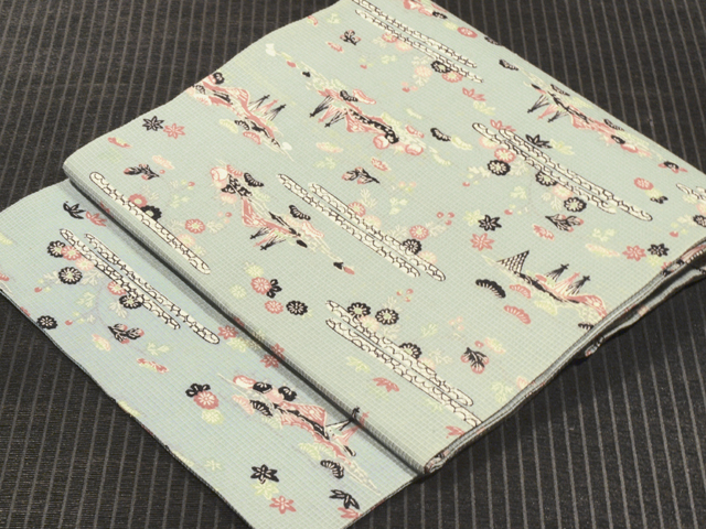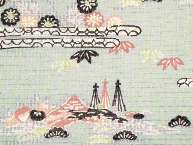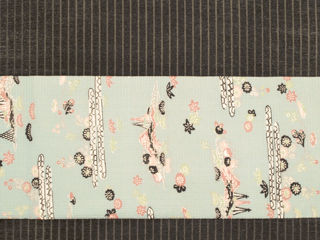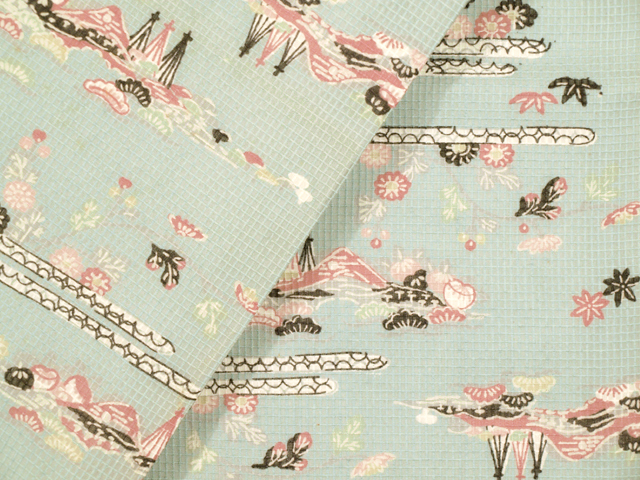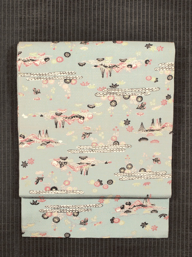 水色味の強い、淡く沈んだ錆青磁(さびせいじ)色の地に、松や菊、楓(かえで)などの草花と遠山、網干(あぼし)や蛇籠(じゃかご)などの水辺の文様が型絵染めされている、綿紅梅の名古屋帯です。夏帯です。 昭和初期ごろにつくられたと思われるアンティークの古布からお仕立て替えがされている創作帯です。紅型(びんがた)調の意匠に素朴なかわいらしさとさわやかさが感じられます。若干の透け感があります。 全体的にうっすらとヤケ気味で、裏面などと比較するとわずかに差があります。また、お太鼓の中央に左右に欠けて筋状のごくうっすらとした黄変があるほか、全体のところどころに直径約 1mm 前後のうっすらとした黄変やくすみがちらほらとあります。お太鼓と胴回りの裏面にも長い筋状の黄変がありますが、ご着用時には隠れます。いずれのダメージもあまり判別はつかず、そのほかに目につく大きなしみやよごれなどのダメージはないので、アンティークにご理解のある方であればご着用は可能と思われますが、状態ランク=「D」のご着用対象外、リメイク素材用とさせていただきます。胴回り内側に接ぎが 1 か所入れられています。 |