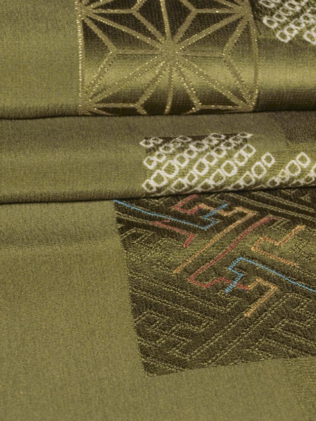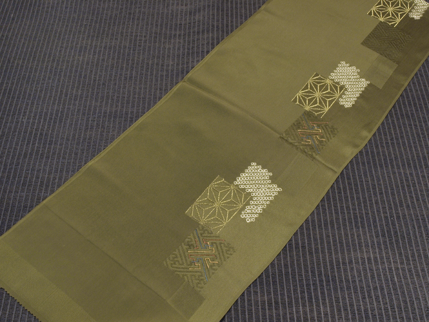 海松(みる)色の地に紗綾形の配された角の地紋が織り出され、金糸の縫取で麻葉野文様、鹿子の絞り染めが施されている、紋綸子縮緬の帯揚げです。 紗綾形の角の地紋の一部には刺繍が施されています。粋な格好良さが感じられる意匠です。 未使用保管品で、しみやよごれ、褪色、穴などのダメージはなく、新品同様です。 |