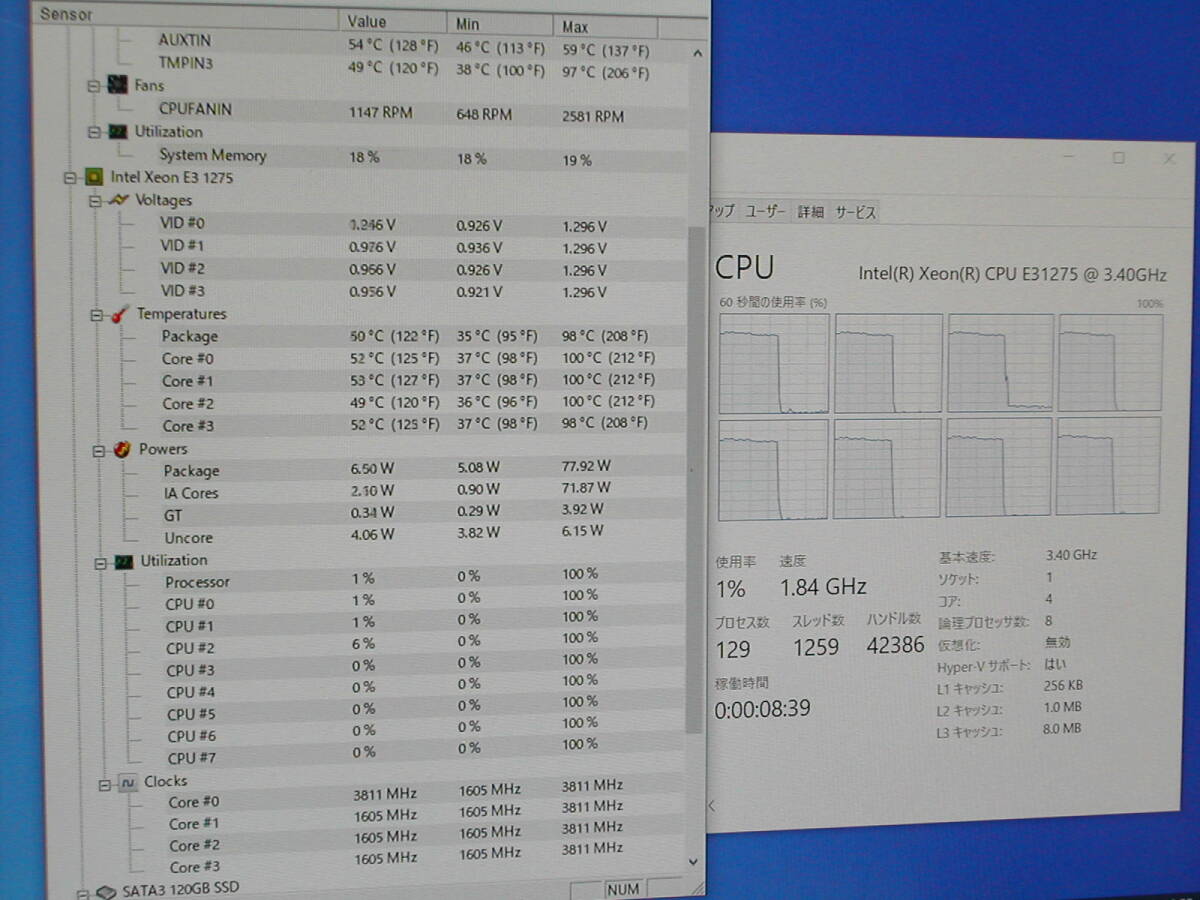 青バックのソフト画像は検査ソフトをPASSした直後の画像です、このくらいの負荷がかかった状態でも普通に動いていました。