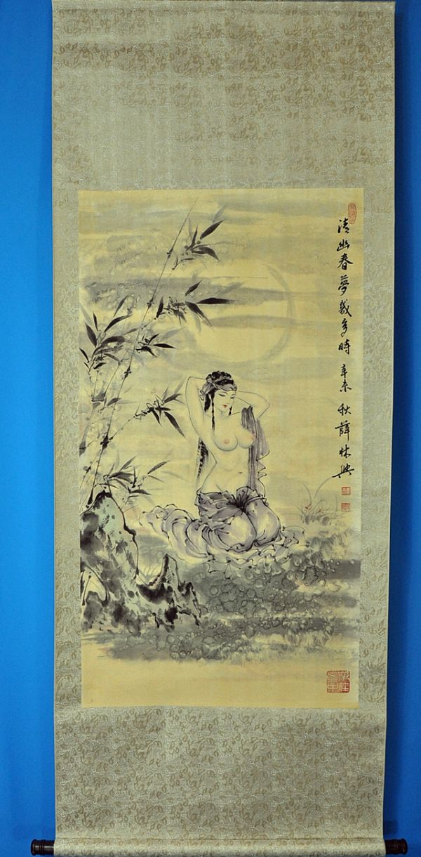 25513f 中国美術 薛林興「涛幽春夢幾多時 裸婦画」 掛軸 紙本 工芸 彩色 美人画 齊白石藝術研究會常務理 中国名家 近代画家 收藏