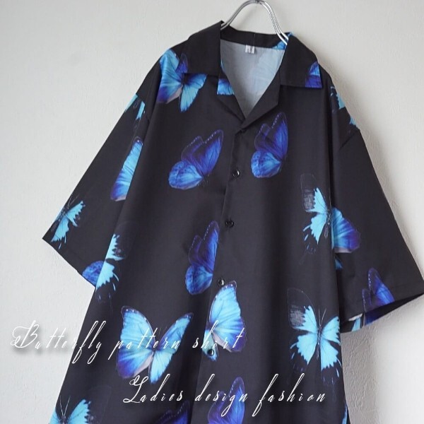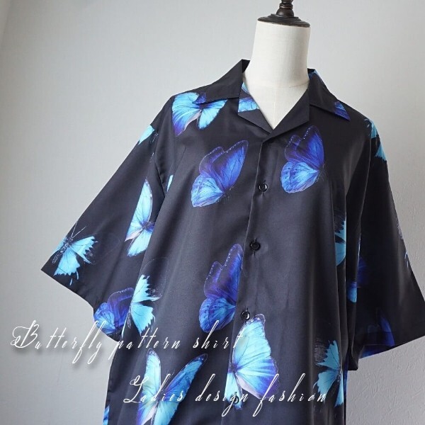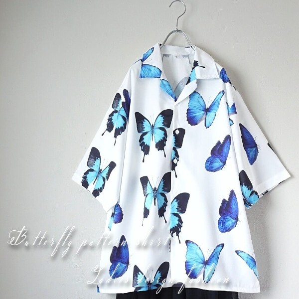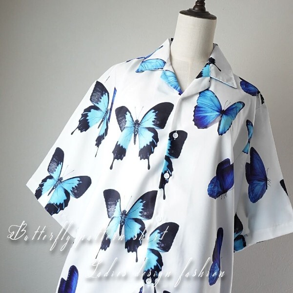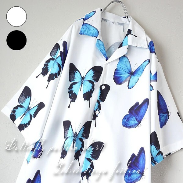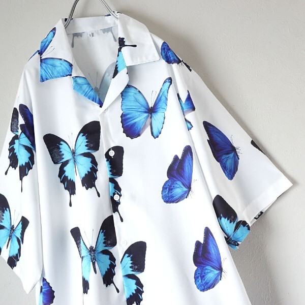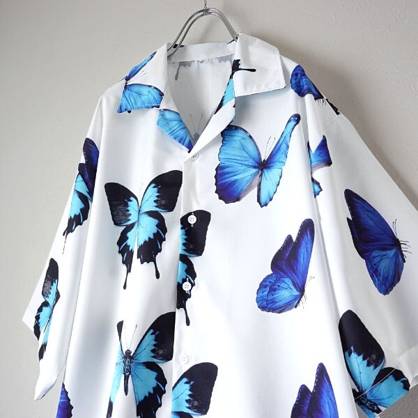 【毎日当日発送】 ホワイト 大きいサイズ 蝶柄 バタフライ模様 開襟 シャツ 半袖 総柄 トップス オープンカラー 夏 レトロ 送料無料 收藏