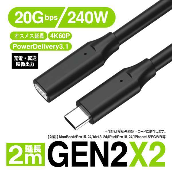 USB-C延長ケーブル [USB-C オス→メス USB-C /映像 /充電 /転送 /2m /USB Power Delivery /240W /USB3.2 Gen2x2] ブラック GEN2X2-2X 收藏