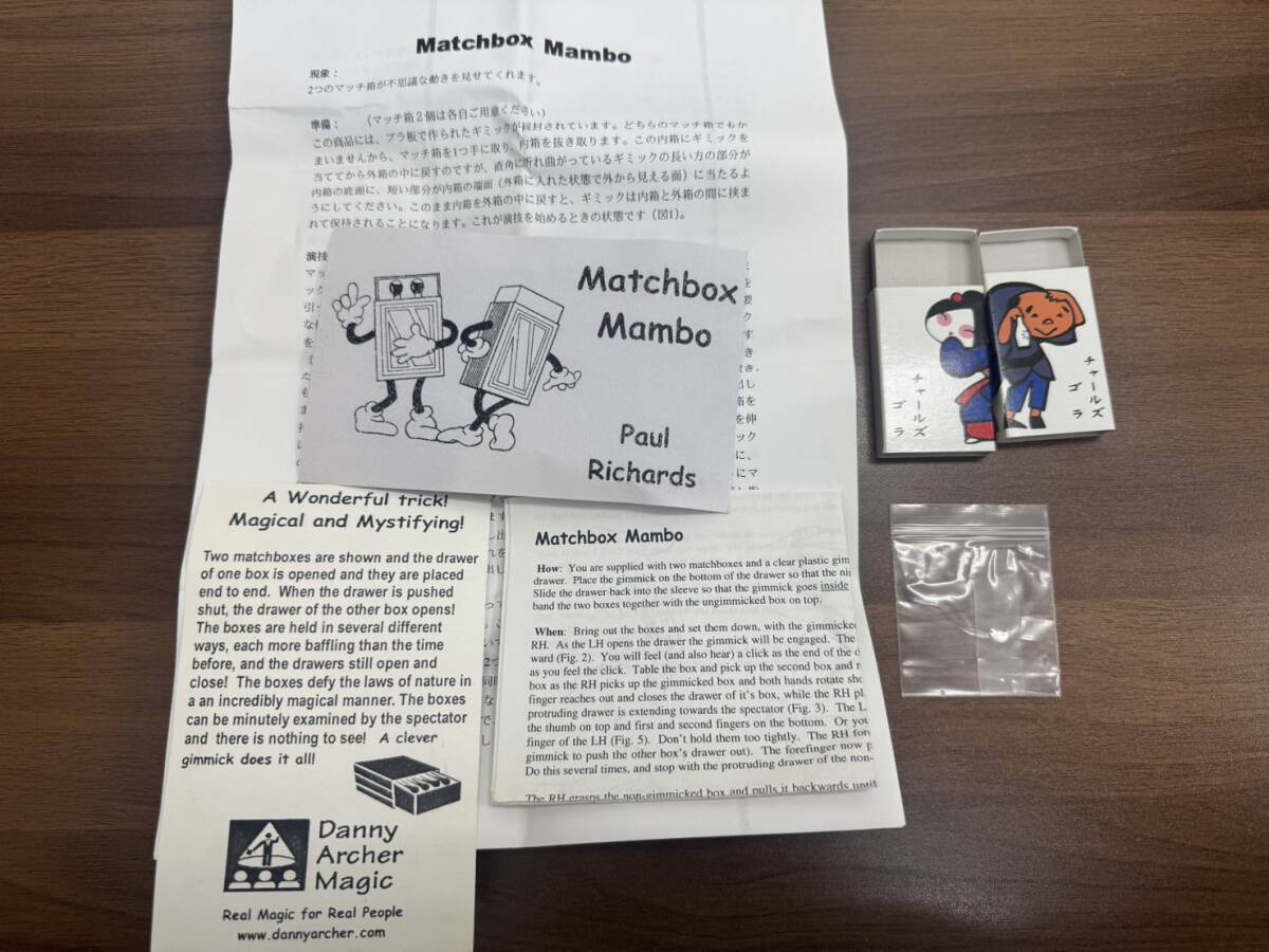 2つのマッチボックスが表示され、1つのボックスの引き出しが開き、それらが端と端を合わせて配置されます。引き出しを押すと、もう一方の箱の引き出しが開きます!箱はいくつかの異なる方法で保持されており、それぞれが以前よりも不可解で、引き出しはまだ開いたり閉じたりしています!ボックスは信じられないほど不思議な方法で自然の法則を無視します。ボックスは観客が細かく調べることができ、見るものはありません!これは私のお気に入りのエフェクトの1つです。見やすく、信じられないほど簡単です。