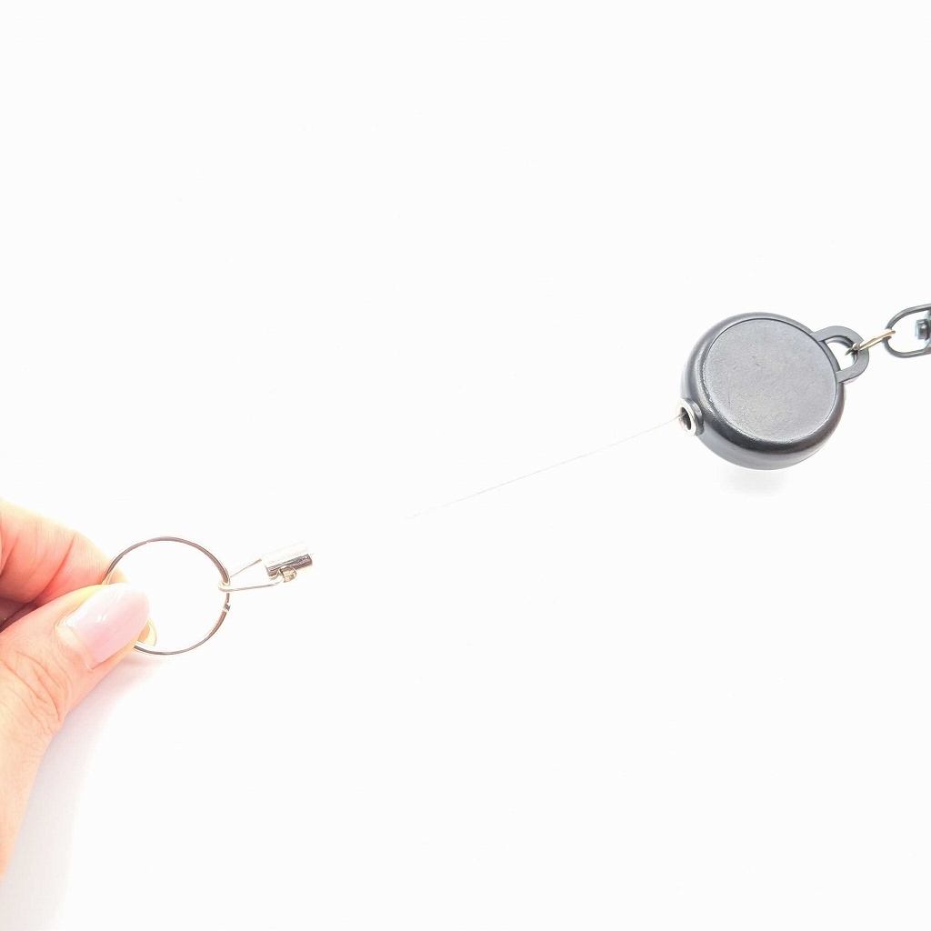 カラビナ付きで持ち運びに便利なシンプルなリールキーホルダーです。伸縮ワイヤーは約62cmまで伸び、鍵やパスケースをバッグやベルトに装着したまま使えます。アウトドアや日常使いに幅広く活躍します。シンプルなブラックカラーで男女問わずお使いいただけます。サイズ:全体 約12×3.5cmワイヤー伸縮:約62cm数量:1個