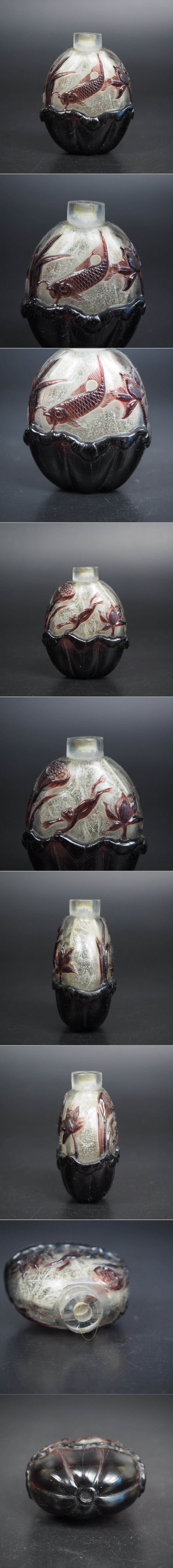 商品説明 | 高さ約 5.8cm 幅約 4.5×3cm ご覧のように、ガラス製鯉蓮彫刻鼻煙壺です。構図がよい、彫りが見事、良い品です。口にホツが見られますが、総じて良好な状態です、詳しくは写真でご確認ください。 |