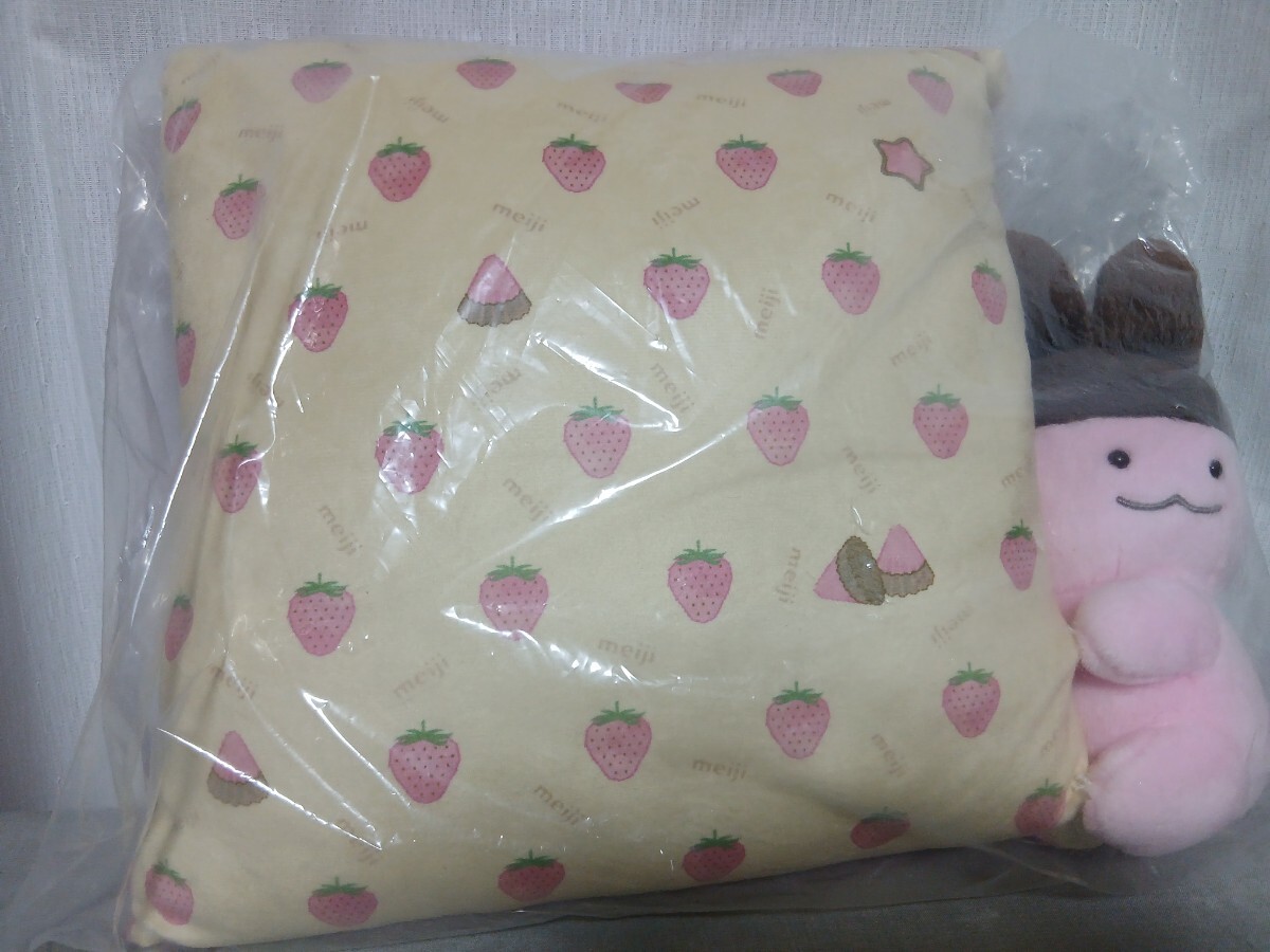 クッションのオモテ面は可愛くアレンジされた「アポロ」とイチゴ柄、ウラ面は落ち着いたピンク色