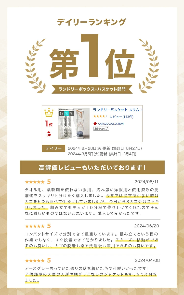 ランドリースペースを無駄なく使える縦置き3段タイプ! 通常のバスケットを分別用に3つ並べて置くと幅を取り、上部にデッドスペースが生まれてしまいます。 こちらの商品は幅約37cmのバスケットを3つ縦に並べることが可能。 デッドスペースを活用することで物が多くなりがちな洗濯機まわりも無駄なくすっきり。 狭くなりがちなスペースを有効に活用することができます。 バスケットの容量は小2つが各15L、大が23L、合わせて53Lの大容量となっております。 3つのバスケットは取り外しも可能で、持ち手があるのでベランダに運ぶ時なども便利にお使いいただけます。 キャスター付きで、ラックごとの移動もスムーズです。 ランドリー以外にキッチンの食品ストッカー、リビングの雑貨入れ、おもちゃ収納も使えます! 【商品仕様】 カラー:ブラック サイズ: スクエア型:(約)幅37.5×奥行き37.5×高さ123cm バスケット内寸 小:(約)幅30×奥行き30×高さ25cm 大:(約)幅33×奥行き33×高さ36cm 重量:(約)3.6kg 容量 スクエア型:(約)59L(小16L×2、大27L) バスケット耐荷重:(約)15kg 素材:スチール(粉体塗装)、ナイロン、他 ランドリーバスケット 2段 3段 1段 大容量 ワイヤーバスケット ランドリーラック 洗濯物入れ かご 洗濯かご 洗濯物 脱衣かご ランドリー収納 ランドリーボックス 洋服 衣服 収納 おもちゃ収納 雑貨入れ おしゃれ シンプル 北欧 西海岸 人気 おすすめ WEIMALL |