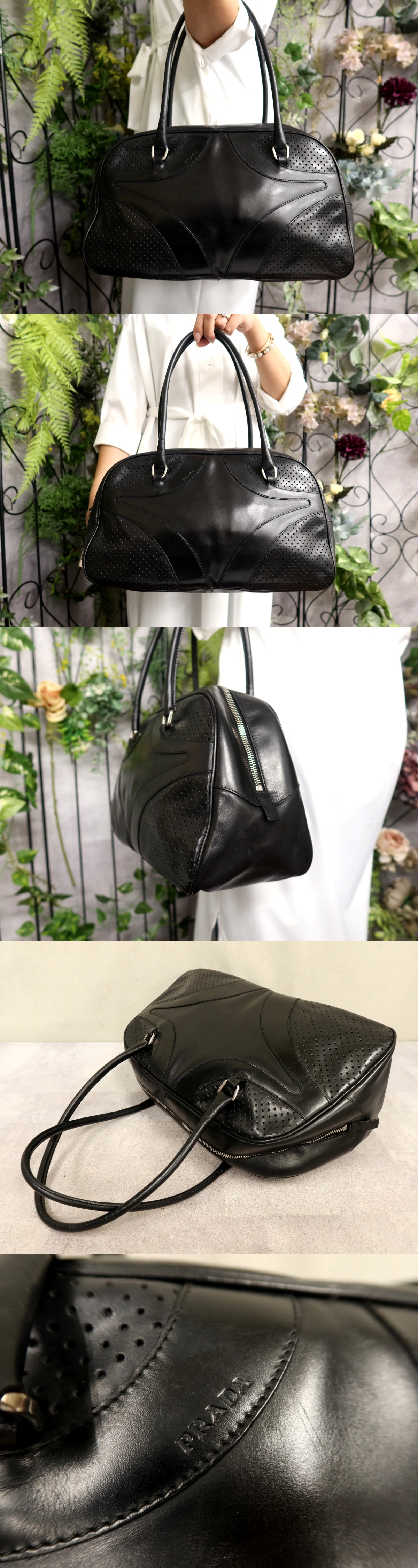 ●超美品●PRADA プラダ●ロゴ型押し●パンチング●カーフ レザー 本革●ハンド ボーリング バッグ●黒●SV金具●イタリア製●B5●Js60930 收藏