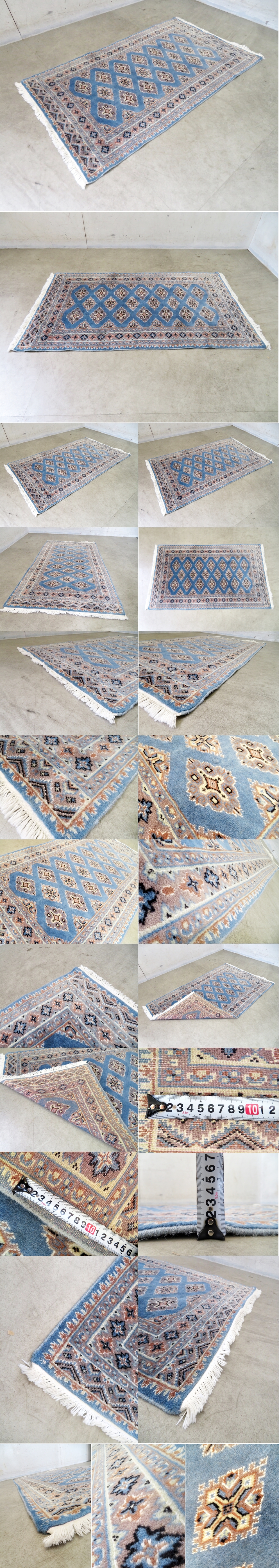 パキスタン製の滑らかに織り上げられた色鮮やかなラグマットです。 パキスタン絨緞の特徴としては、幾何学文様の連続柄があげられモダンな柄、 色のバリエーションが多く、手触りの良いのが特徴です。 現代的なインテリアにも調和すると人気です。 ウールは熱伝導率が低く、吸湿性に優れているため、 冬は暖かく、夏は涼しく年間を通して使用できます。 美しくしなやかな風合い、 汚れにも強くて、お手入れが簡単です。 肌ざわりも柔らかく、生地表面の風合いにも高級感があります。 もちろん保温性にも優れていますので、大変重宝します。 この機会に是非!! コンディション:モデルルーム展示品の為、写真の様な傷、汚れがありますが、その他は大きなダメージはなく美品です。 サイズ横150センチ奥行き90センチです。