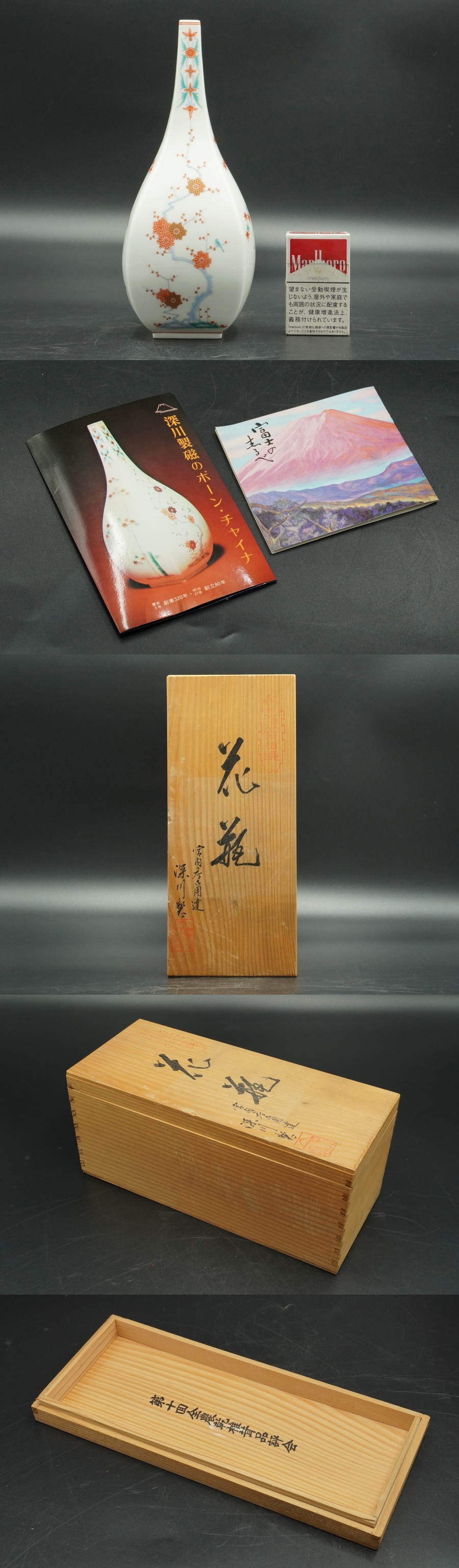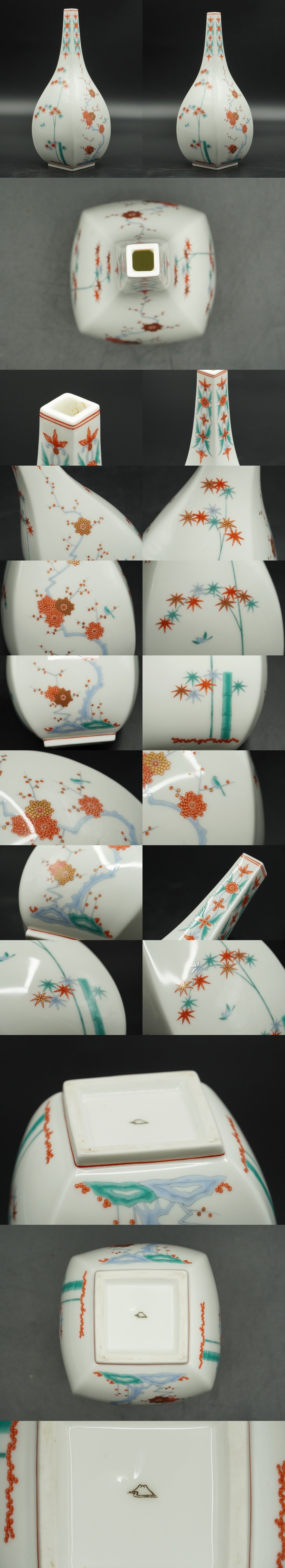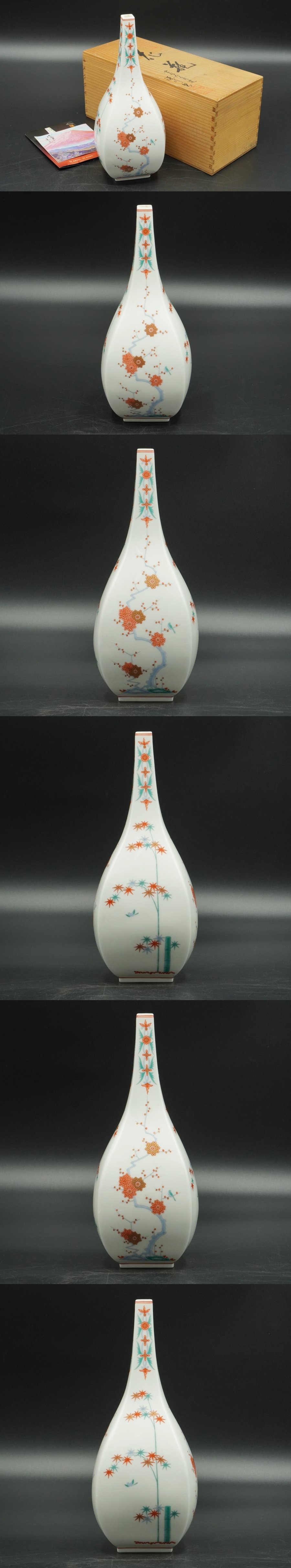 【楽久希】深川製磁 花瓶 在銘 共箱 共栞 色絵錦 梅竹図 鶴首四角型 花壷 飾壺 床飾 花入 花生 花器 華道具 茶道具 有田焼 收藏