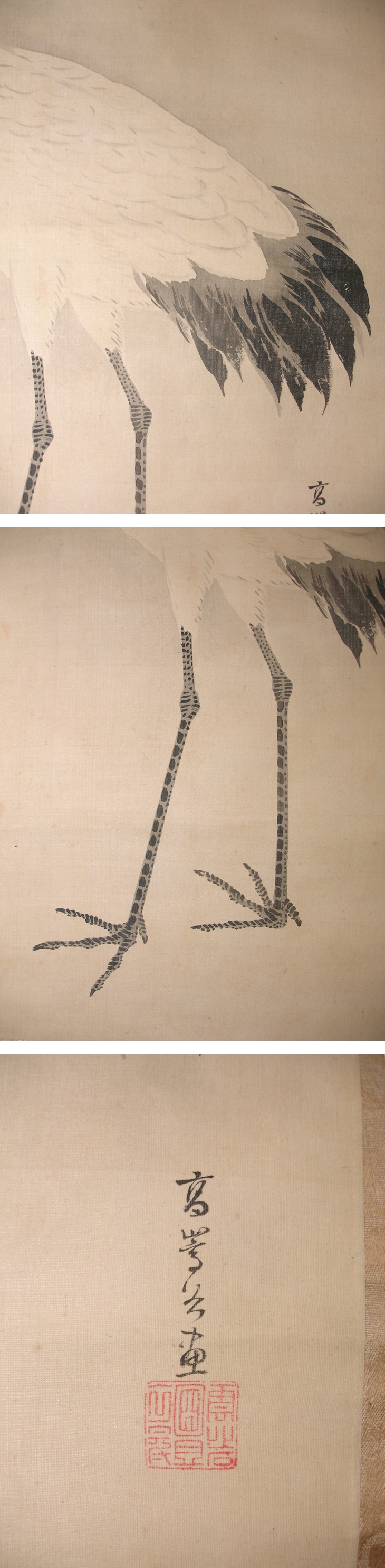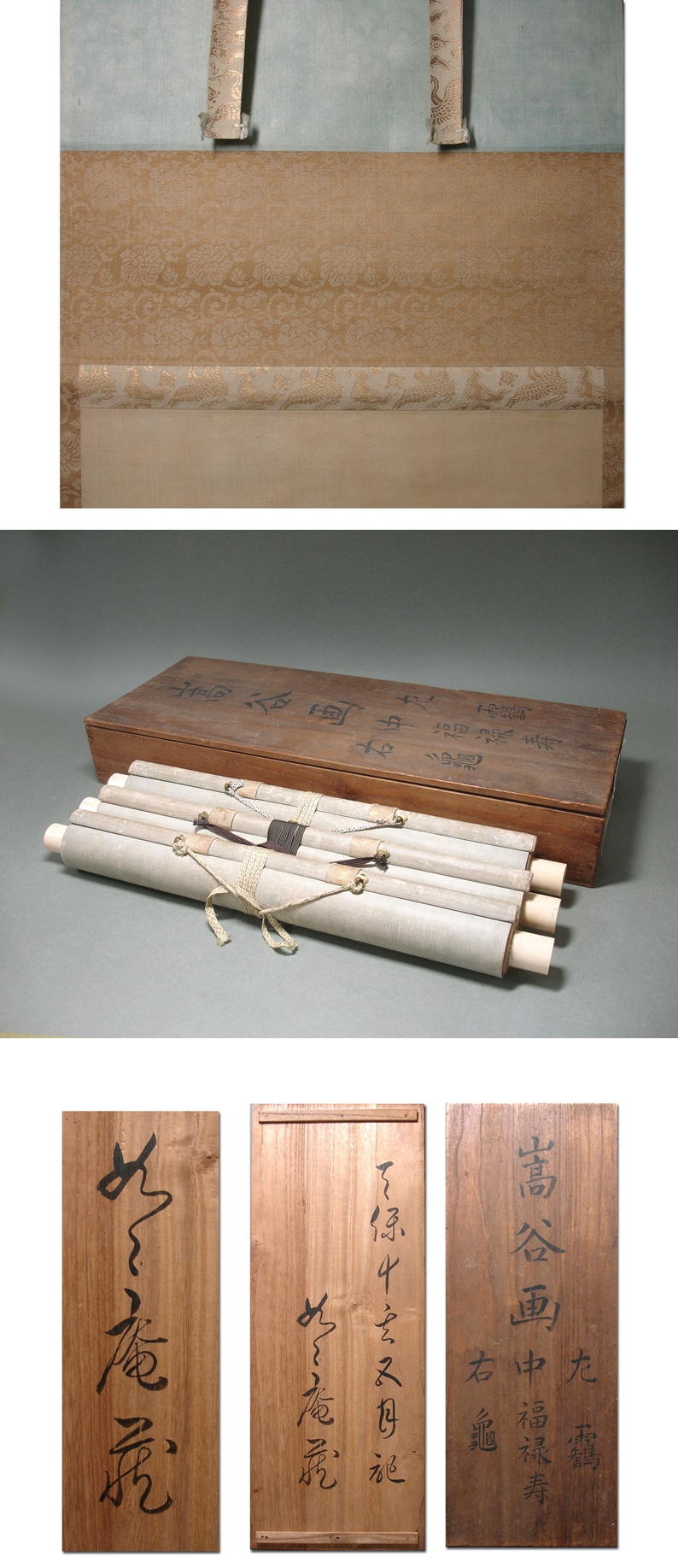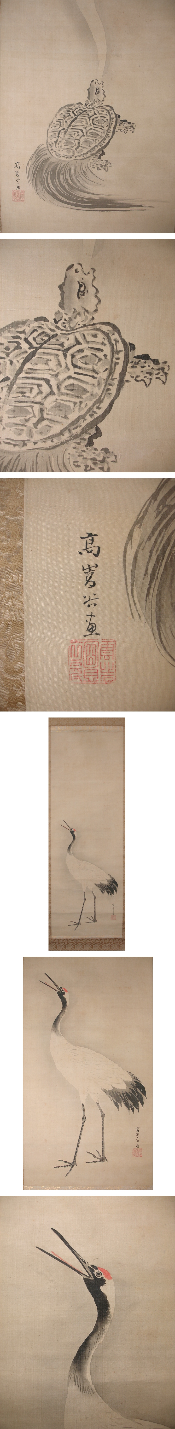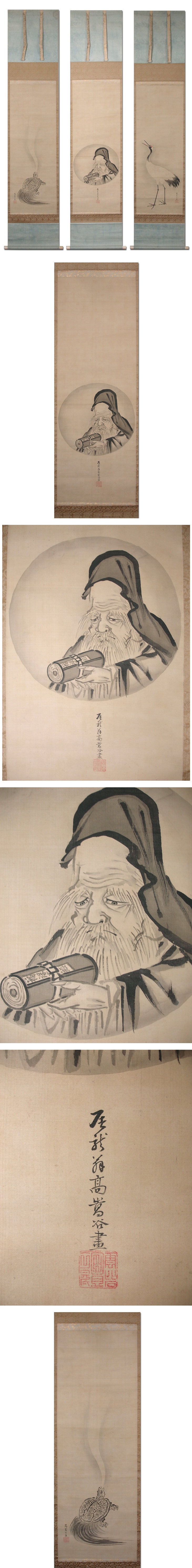 慶應◆江戸後期 英一蝶派の町絵師【高嵩谷(崇谷)】真筆 絹本墨淡彩 福禄寿に鶴亀図 三幅対 旧蔵箱入(天保年間の墨書あり) 收藏