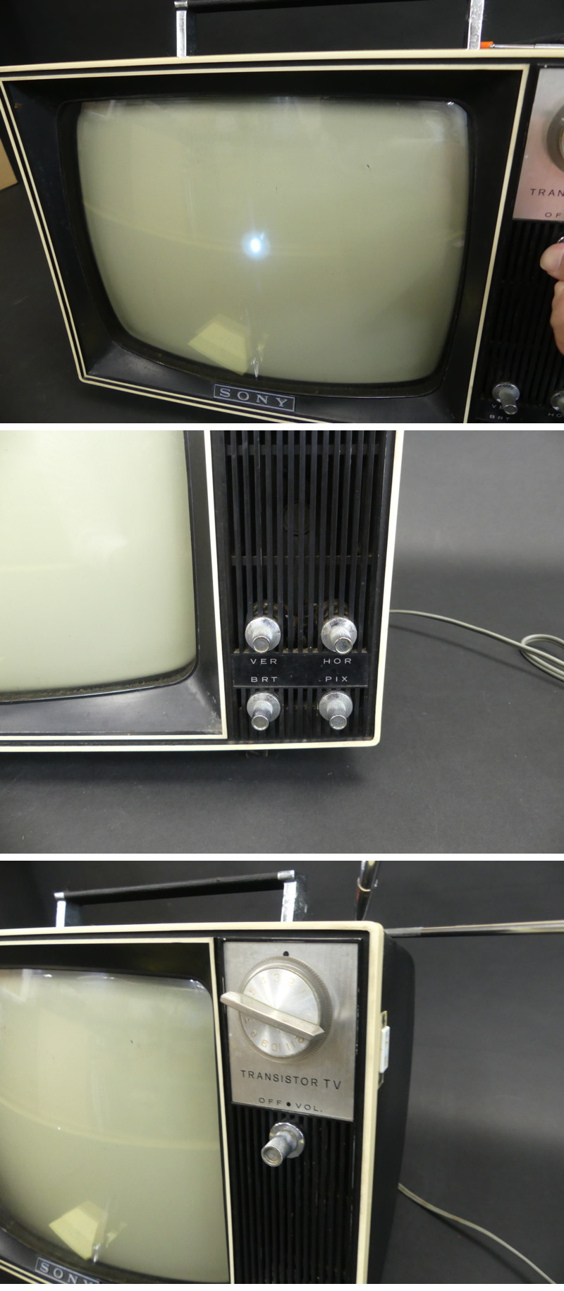 ◇商品情報◇ | 当店の商品をご覧いただきありがとうございます!! 当時物 テレビ SONY ソニー TV-120D トランジスター TV 白黒 昭和 ビンテージ コンセントにて電源を入れてON/OFF時に画面に光点は出ましたがつまみを操作しても砂嵐などは出力されませんでした。 ボリュームツマミ操作時にガリ音を含むノイズ音はします。 古いテレビですので現状でのお譲りとなります。 アンテナは途中で切れています 経年相応の色焼け、金属くすみ、汚れ、キズなどがございます。 状態などは画像よりご確認、ご判断くださいませ。 ※目視チェックをしていますが、表記漏れや見落としや細かな擦れ・薄汚れなどがある場合もございますので予め画像をご確認の上でご入札をお願いいたします。 商品のトップ画像端に写っている茶筅はサイズ比較用の備品ですので付属はしません | ||||||||||||||||||||||||||||||