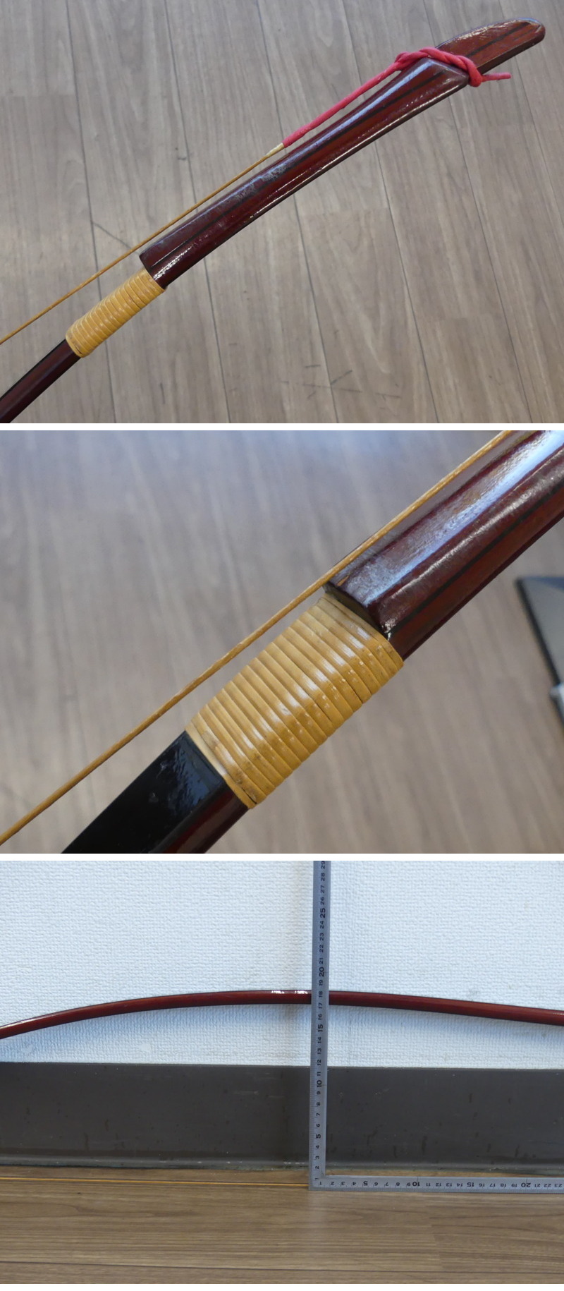 ◇商品情報◇ | 当店の商品をご覧いただきありがとうございます!! グラス弓 弓道 練心 218cm 和弓 重量528g 弓道具 経年相応の傷汚れ、使用伴うダメージなどはございます。 目視の限りでは割れや離れといった箇所は見当たりませんでした。 約/サイズ/cm/弦を張った状態で採寸しています 重量528g 握り下厚み2.1 握り下幅 2,5 ※弦を張った状態で弓の先端から末端まで直線で約218cmでした(画像参照) 弓力につきましては弦の劣化、測定環境が無いた未計測です。 弦については古い弦をおつけしてありますが痛みがある古い弦ですので張替え前提としてお考えください。 弓道経験者、識者がいないため現状でのお譲りとなります。 状態などは画像よりご確認、ご判断くださいませ。 ※目視チェックをしていますが、表記漏れや見落としや細かな擦れ・薄汚れなどがある場合もございますので予め画像をご確認の上でご入札をお願いいたします。 商品のトップ画像端に写っている茶筅はサイズ比較用の備品ですので付属はしません | ||||||||||||||||||||||||||||||