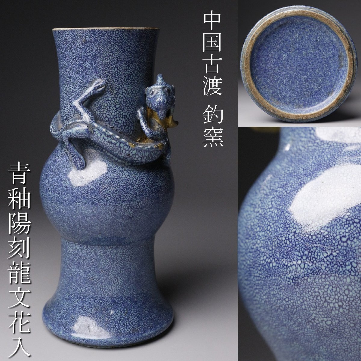 【LIG】中国古渡 釣窯 青釉陽刻龍文花入 20㎝ 古玩 数奇者秘蔵品 [.TP]25.10 收藏
