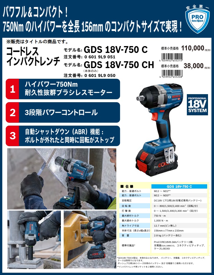 ボッシュ BOSCHコードレスインパクトレンチGDS18V-750CH本体のみです。※バッテリ・充電器・ケースは別販売品です。■特長1.ハイパワー750Nm 耐久性抜群ブラシレスモーター2.3段階パワーコントロール3.自動シャットダウン(ABR)機能:ボルトが外れたと同時に回転がストップ■仕様・能力:普通ボルト:M12 ~ M22**・能力:普通ボルト:M12 ~ M20**・定格電圧:DC18V (プロ用18V充電式専用バッテリー)・回転数:0-800/1,500/2,400(回転/分) ・打撃数:0-1,500/2,300/3,300(回/分)・最大トルク:750N・m ・最大緩めトルク:1,000N・m・角ドライブ寸法:12.7mm・本体寸法:長さ156mmx幅77mmx高さ233mm・質量:2.8kg※バッテリー装着時(バッテリーは別販売品です)**インパクトレンチ用ソケットをご使用ください。