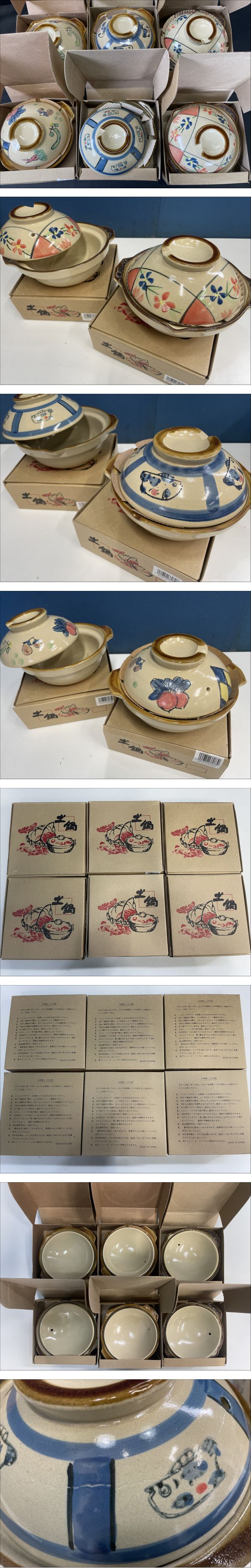 11-B33/2-100 小鍋 土鍋 一人用鍋 6点セット ガス火専用 蓋付き 直径約17㎝ 花柄 野菜柄 フグ柄 箱付き 收藏
