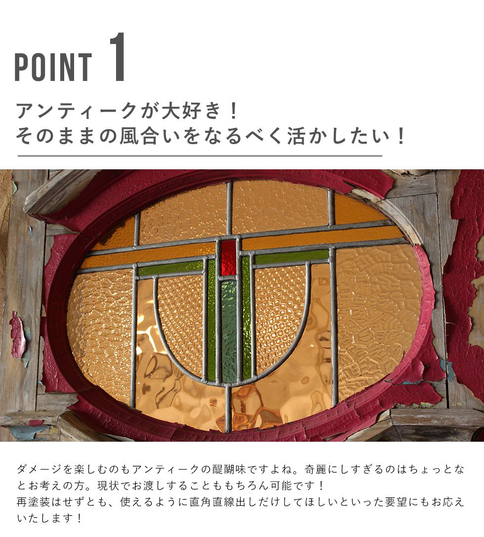 イギリス、フランスを中心にヨーロッパ中から直接買い付けをした本場のアンティーク品となります。 高級なイメージのアンティークですが、当店ではリーズナブルにアンティークをお楽しみい頂けるよう、ステンドグラスは一度に1,000枚以上。アンティークドアも100枚以上を一度に輸入。 全国でも有数の買い付け量を誇ります。 創業以来現在の買い付け量を保つ事で、現地ディーラーとの密な信頼関係を構築。当社に向けてより良い物を提供してもらえる環境作りを維持し、現在では現地取引先約20社と提携しています。 また当店ではアンティークのプロフェッショナルが常駐する工房を完備。修理、メンテナンスはもちろん、ステンドグラス、ドアの制作からカスタムまで、アンティークのご相談はウェリントンにお任せください。 ネットに載っていない商品もまだまだございます。京都伏見のショールームにも是非お越しくださいませ。 ※修理に関するご注意※ ■ 標準修理に関しては別途料金にて承ります。事前に仕上がりサイズを必ずご確認くださいませ。 ■ 標準修理をご依頼の場合、決済確認後の着手となります。恐れ入りますが代引きでのご決済はお断りしております。 |