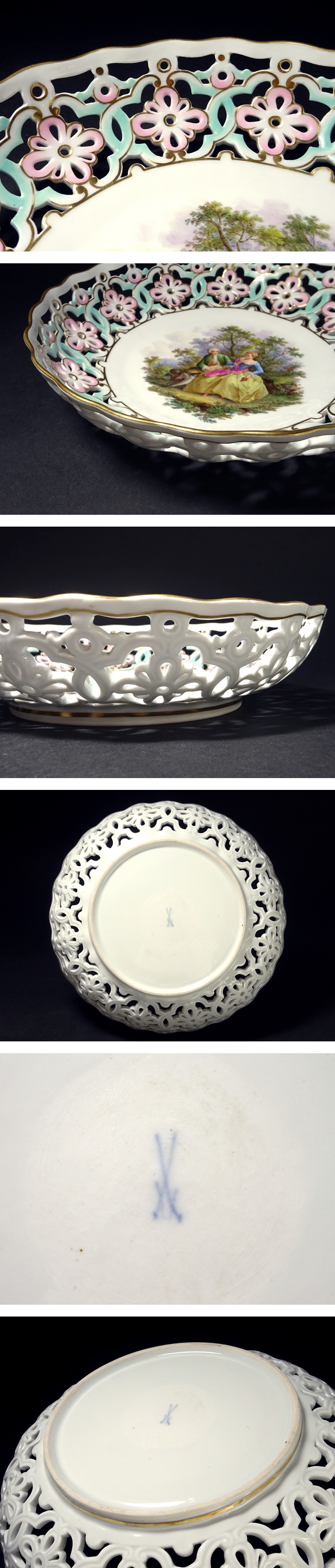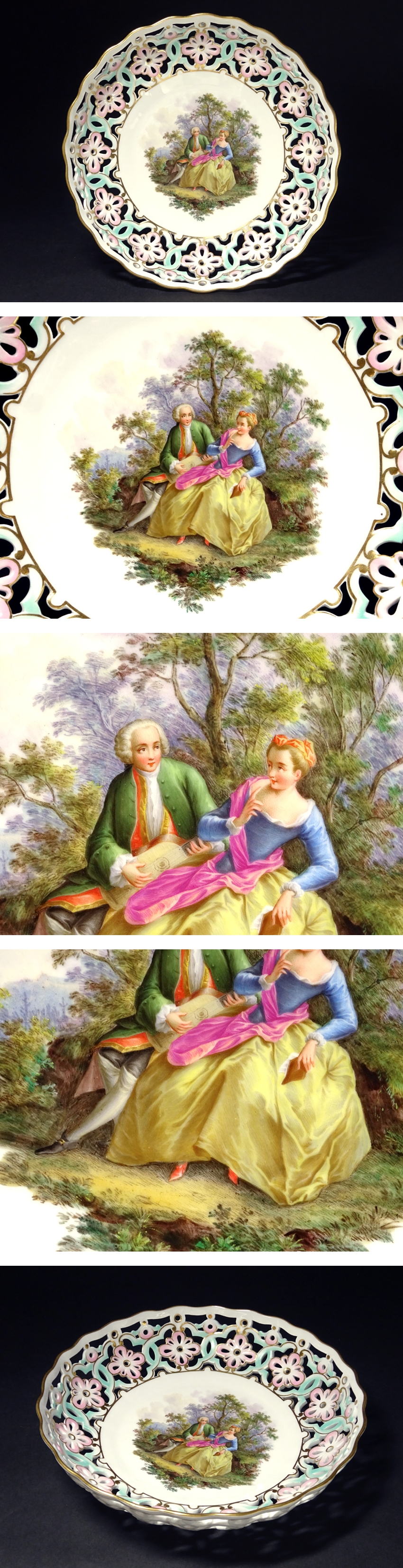 慶應◆19世紀後期頃【Meissen オールドマイセン】ロココ様式 ハンドペイント『Watteau ワトー』金彩透かし装飾 飾皿 直径26.5cm 收藏