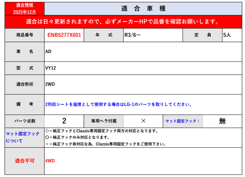 [クラッツィオ]VY12 AD_2WD(R3/6~)用カスタムラゲッジマット[ENB5277X601] 收藏