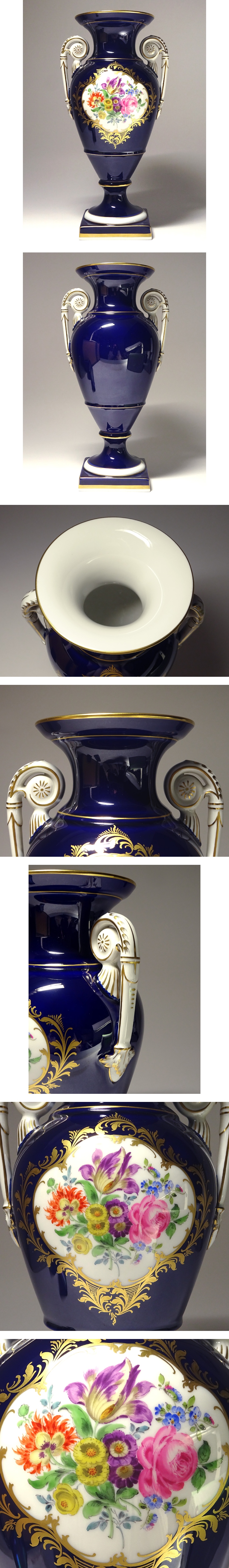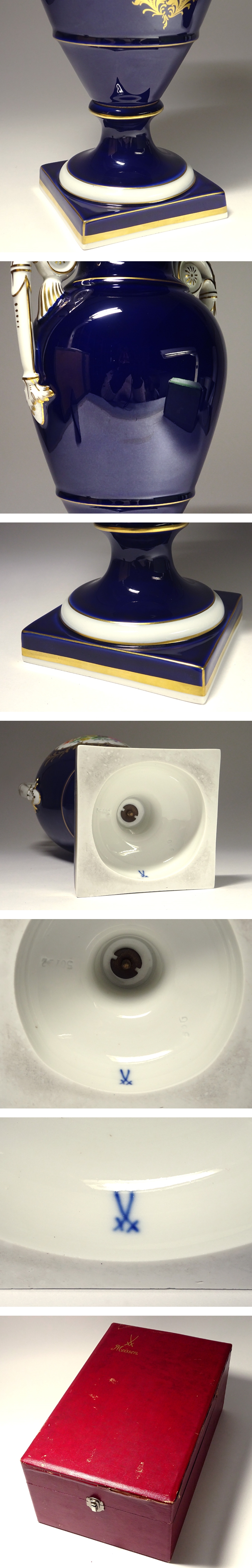 慶應◆【MEISSEN マイセン】エンパイアスタイル コバルトブルー金彩フラワー アンフォラ型ベース 花瓶 飾壷 收藏