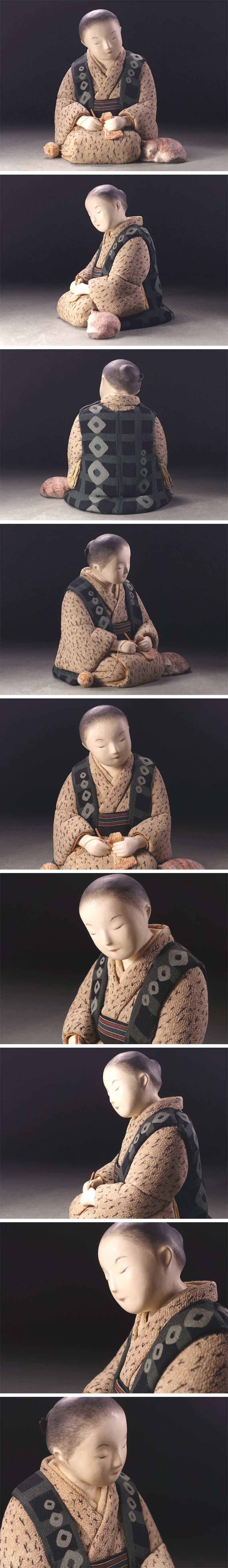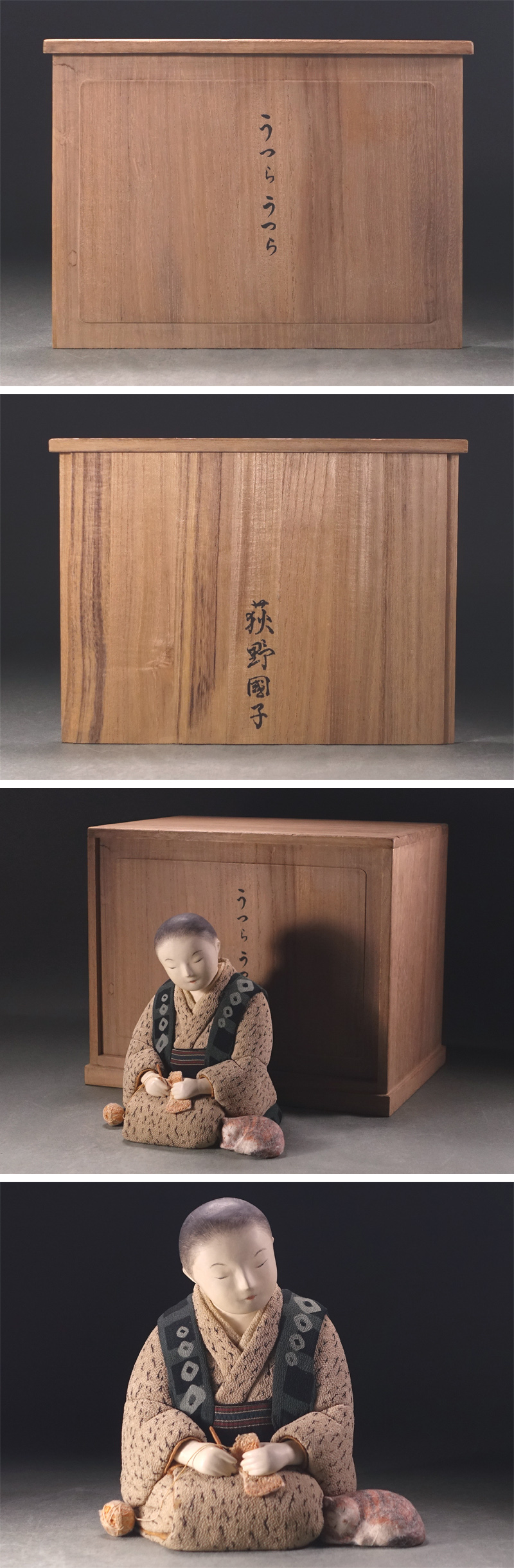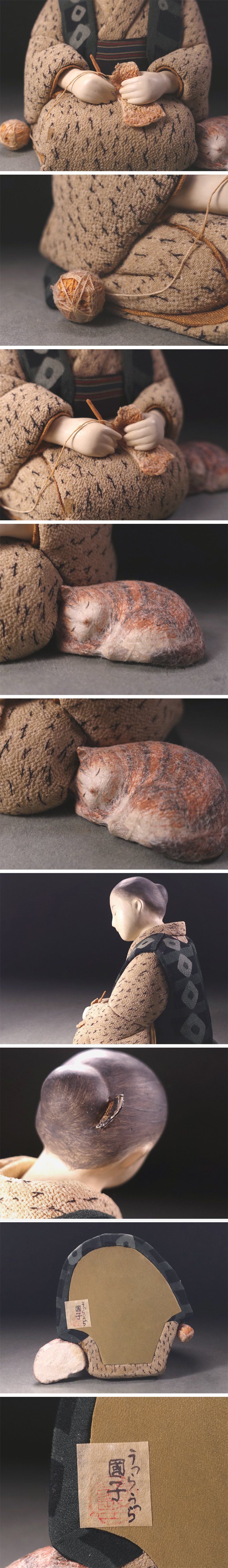 ∇花∇人形作家【荻野國子】作 桐塑胡粉彩色木目込人形「うつらうつら」 共箱付 ほのぼのした猫と編み物 收藏