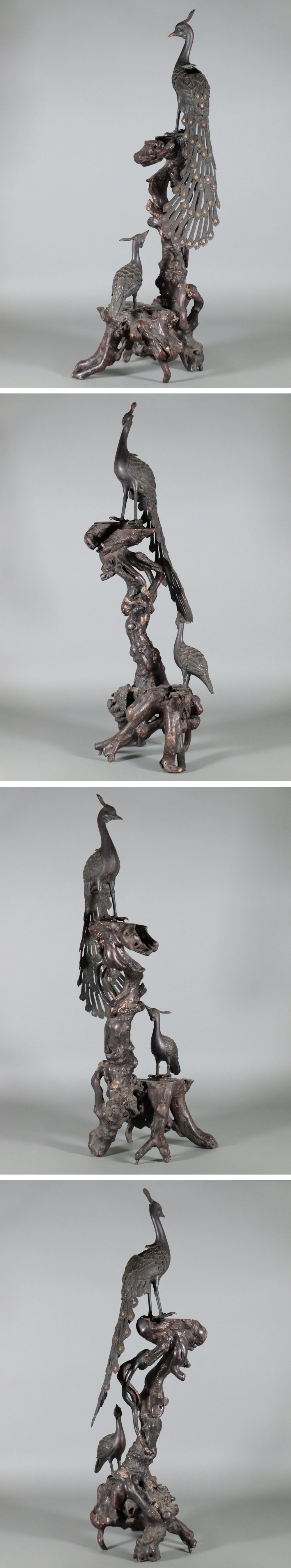 金工美術 古銅 銅製 鍍金 塗金 孔雀 鳥 香炉 / 天然木 根木 根卓 台座 飾台 / 香道具 香爐 時代物 骨董品 古美術品 / 高さ89cm 收藏
