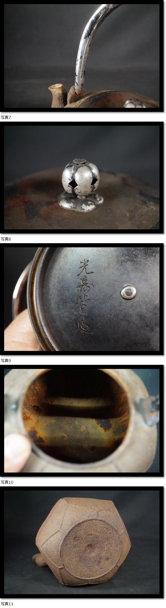 | 銀張り持ち手 銀象嵌 鉄瓶 六角 茶瓶 茶器 煎茶道具 光寿堂造 銀摘み |