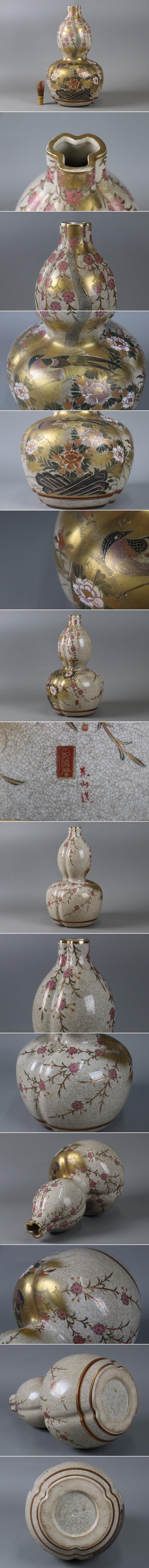 薩摩焼 薩摩 光山造 色絵金彩花鳥図 瓢箪形 花瓶 高46,5cm 飾壷 細密細工 古美術品[e9] 收藏