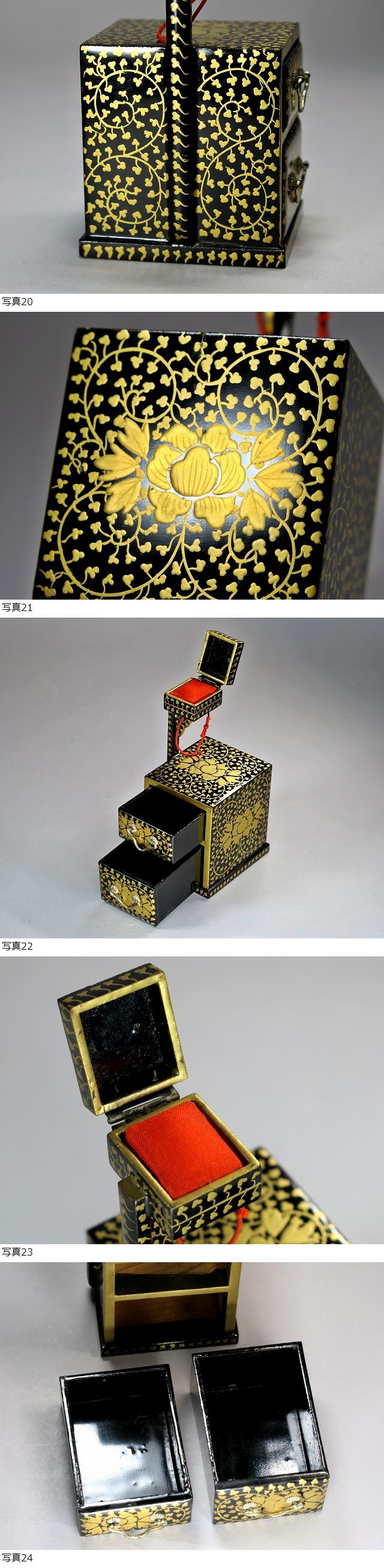 創業1808年から200年以上京都四条で営業を続けている 京都 田中彌作 御三荷揃 鏡台・針箱です。 天然木の木地に漆を塗り重ね、本金唐草蒔絵が全体に施されています。 金具の部分など細かなところまでとても丁寧な見事なつくりです。 包み和紙の袋に「京都田中」「大極上本金蒔絵唐草」の印があります。 共箱。状態はとても良好です。