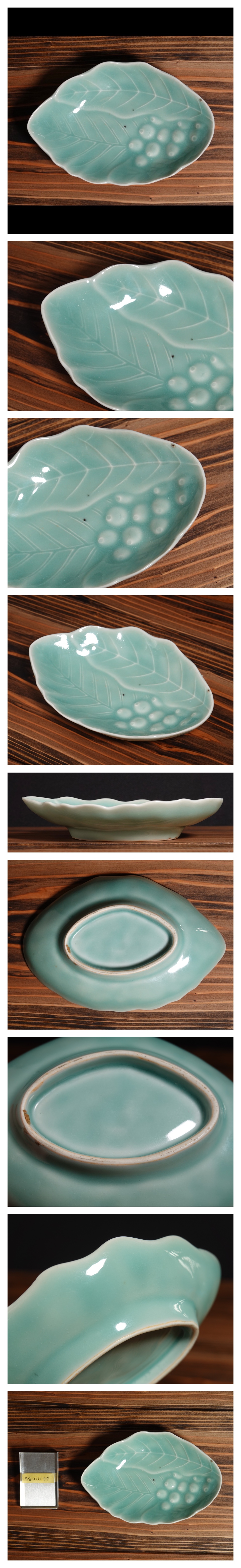 【聖陽堂】江戸時代 後期 鍋島藩窯 『 青磁 鞘豆文 陽刻 葉形 変形皿 』 小皿 鍋島青磁 図録同手掲載 【向付 取皿 銘々皿】 r8 0111 07 收藏