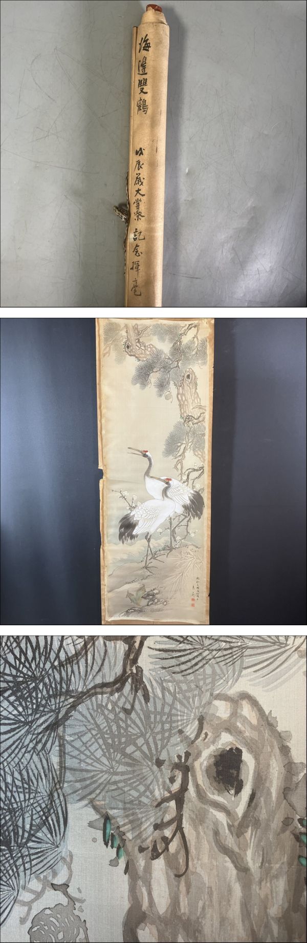 M2-418 掛軸 絹本 海辺 双鶴図 大嘗祭記念 記念揮毫 昭和三年戊辰夏日 松竹鶴亀 在銘/落款有り |