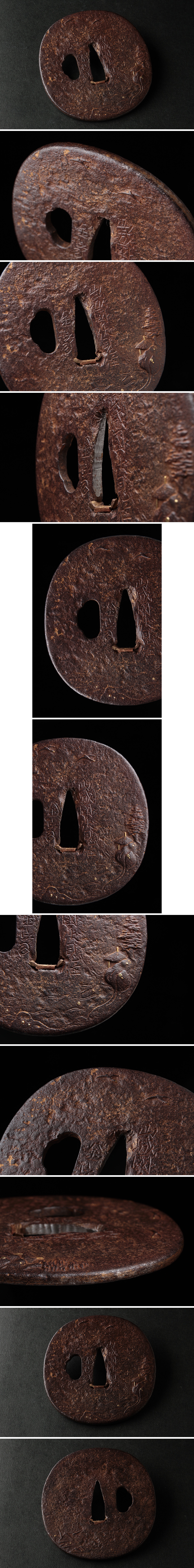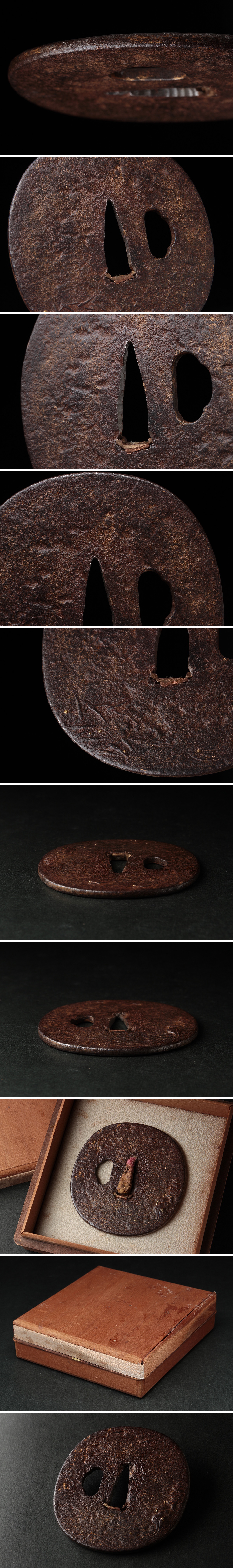 | ◆ 時代刀装具【銘 山城伏見住金家】鉄地 肉彫 金象嵌 風景図鍔 縦7.7cm 木箱附 ・鉄象嵌鍔・古鍔 武具 古美術 小道具 ◆