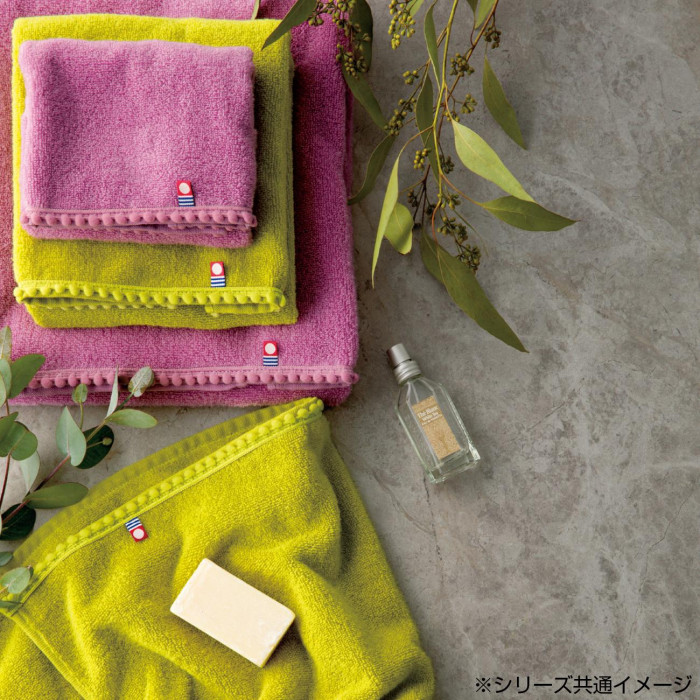 | 大人っぽいピスタチオカラーにかわいらしいポンポンを付けたタオルです。やわらかくて肌ざわりの良い無撚糸を使用しています。 |