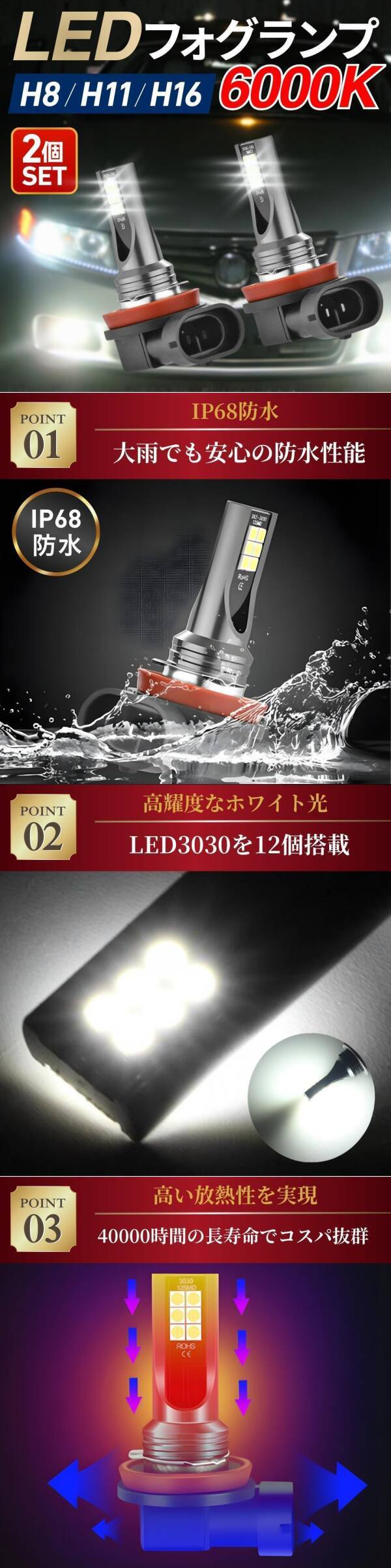 LED フォグランプ ヘッドライト バルブ 車 H8 H11 H16 6000K 2個セット1400lm 爆光 3030×12灯 白 ホワイト 汎用 交換 12V 長寿命 高輝度 收藏