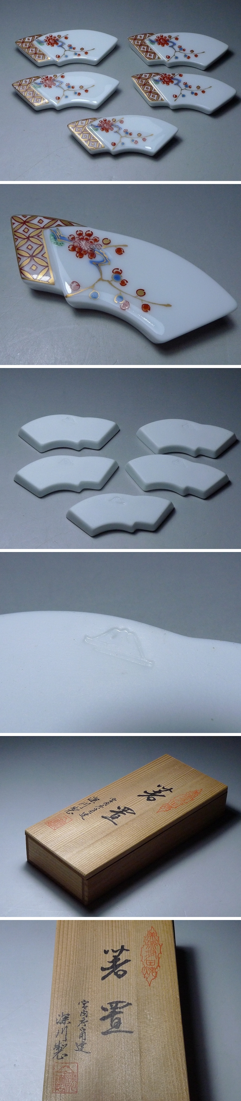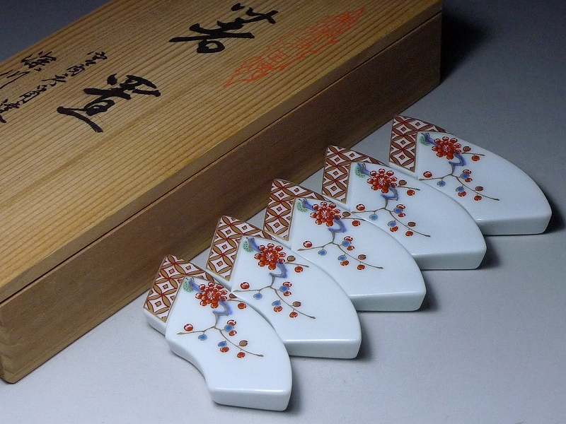 60HT237★有田焼 深川製磁造 金彩色絵梅花文箸置 5客揃 宮内庁御用達 共箱 收藏