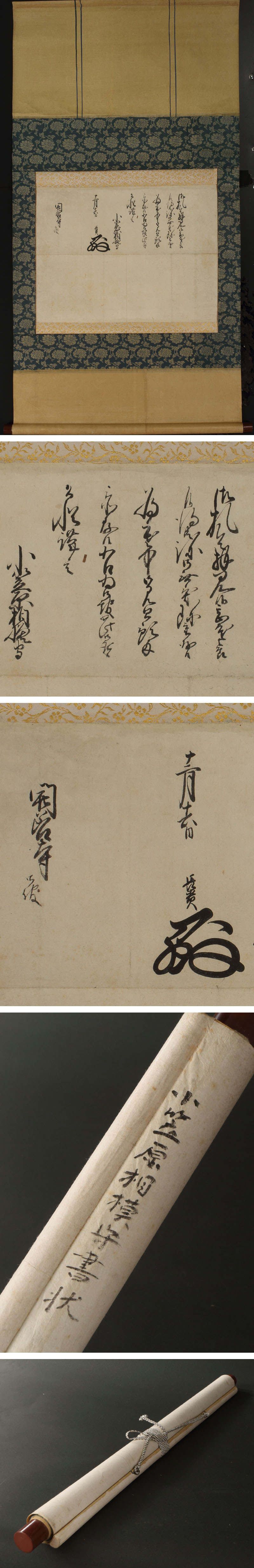 小笠原長貴の書状です。 菩提寺の勝山開善寺に宛て、寒中見舞の御礼を綴った書です。開善寺は家祖小笠原貞宗が信州飯田に開基した寺院を前身とし、小笠原家の移封に伴い本庄(現・埼玉県本庄市)、古河(現・茨城県古河市)、関宿(現・千葉県野田市関宿町)、高須(現・岐阜県海津市)に同名寺院が創建されました。 長貴の治世の勝山は火災に一揆と多難続きでしたが、開善寺に父祖の墓碑を造立し、天保3(1832)年には開善寺14世の肇山禅基和尚に信胤・信房・長教の肖像の着賛を請うたことが知られます。父長教も13世天乳祖養に参禅しており、代々の帰依が篤かったことがわかります(「開善寺文書 小笠原家譜(抄)」『勝山市史 資料編 第1巻』)。 幕政で多忙の間も勝山を案じ続けたであろう藩主の遺した逸品です。 ◆小笠原長貴 江戸後期の大名。小笠原長教の子。寛政11(1799)年越前勝山藩主。奏者番,若年寄をつとめた。治世中に文政5(1822)年の勝山城の焼失、同11(1828)年の勝山文政一揆、城下の大火などがおこった。天保11(1840)年没、48歳。 ◆開善寺 福井県勝山市の寺院。臨済宗。元禄4年(1691年)、越前勝山藩に小笠原貞信が移封されたときに建立された。元来は信濃小笠原氏の先祖に当たる小笠原貞宗が生地である飯田に建立し、その後領地の変更に従って移転を経たという。境内には小笠原貞信から小笠原長守までの歴代越前勝山藩主およびその家族の墓があり、昭和50(1975)年に勝山市の文化財に指定。 〔本文〕 御札令拝見候、甚寒節 候得共、弥御無異珍重存候、 為寒中御見廻預示 忝存候、右為御報如此御座候、 恐惶謹言 小笠原相模守 十二月十六日 長貴(花押) 開善寺 御報 付属:共箱 無が付属します。 寸法:高さ117cm、幅61cm(最大幅。若干の誤差はご了承下さい) 状態:経年のイタミがございます。 |