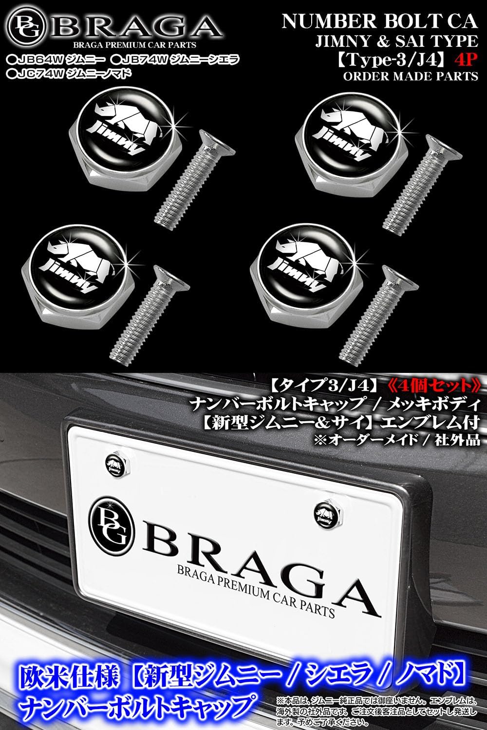 [タイプ3J4]4個セット/JB64W 新型ジムニー/サイ & Jimnyエンブレム付/メッキボディ/ナンバー ボルト キャップ/欧米仕様/ブラガ BG BRAGA 收藏