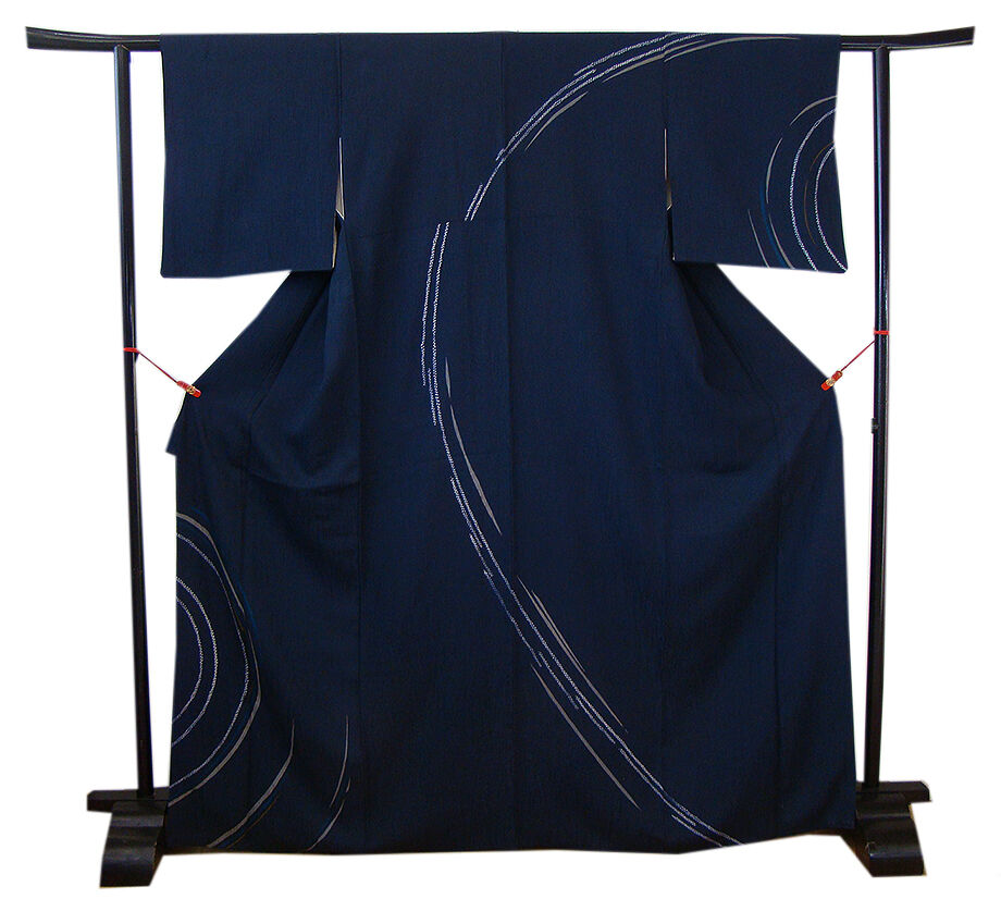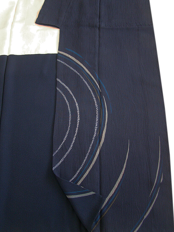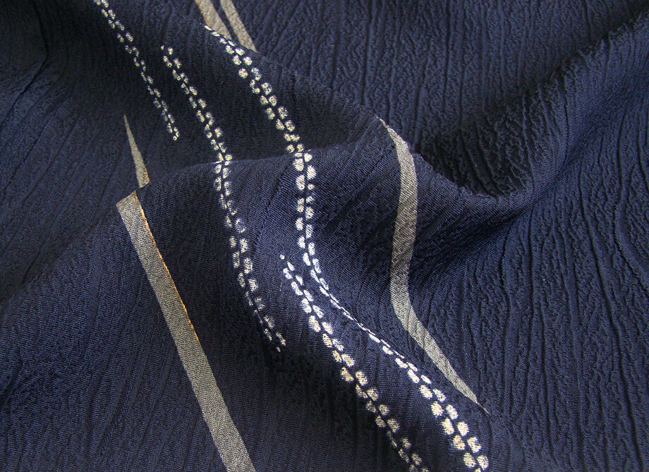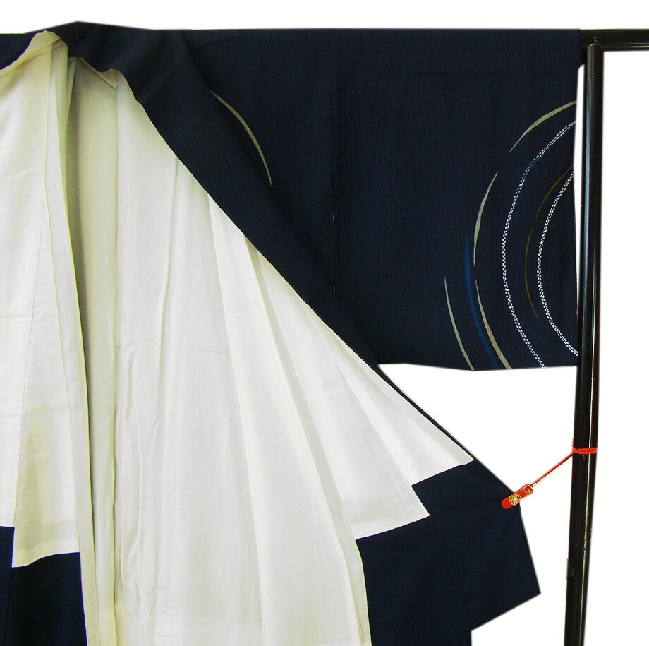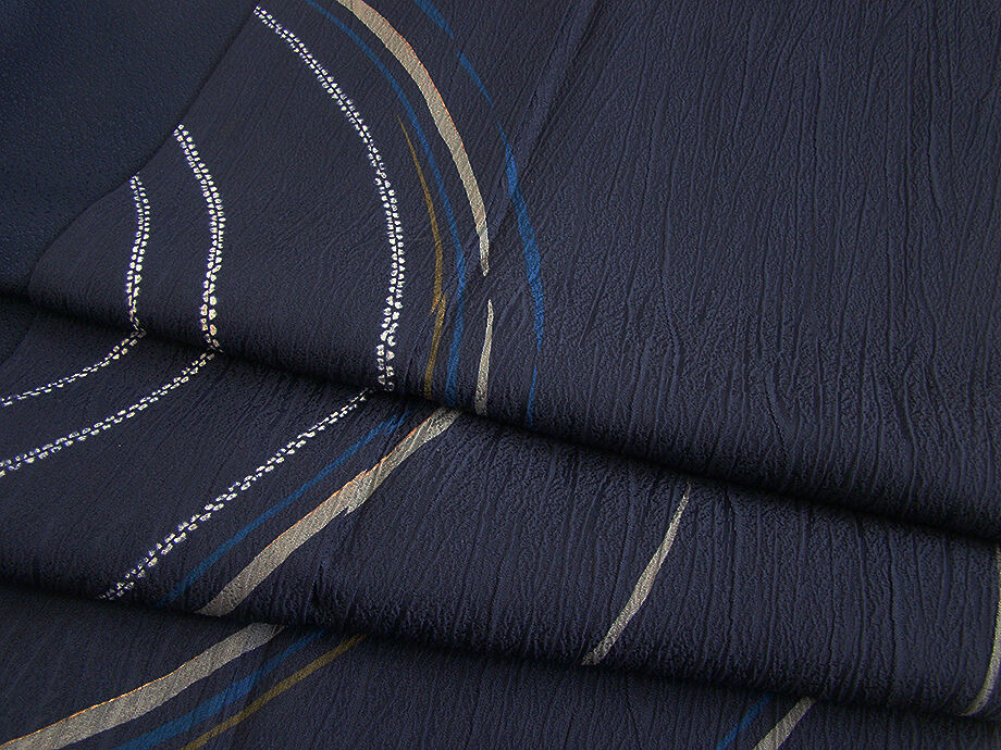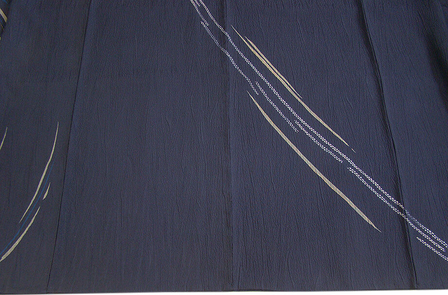 | 商品説明 | こちらのお品は「袷」でございますので、10月~5月までお召頂ければと思います。 しなやかで柔らかな手触りのぽってりふっくらとした重めの極上ちりめん地のフクレ織の生地、 藍紺色地に鼠、金茶、白色等の染柄、 八掛は共色に柄入り(正絹)、幅広い年代の方にお召頂けます。 |