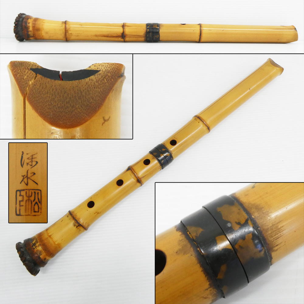 K264) 都山流 尺八 松下 深水 銘有り 一尺八寸 中継ぎ 鼈甲 全長約54cm 重量約385g 木管楽器 和楽器 縦笛 雅楽 骨董【 ひび割れ有 】 收藏