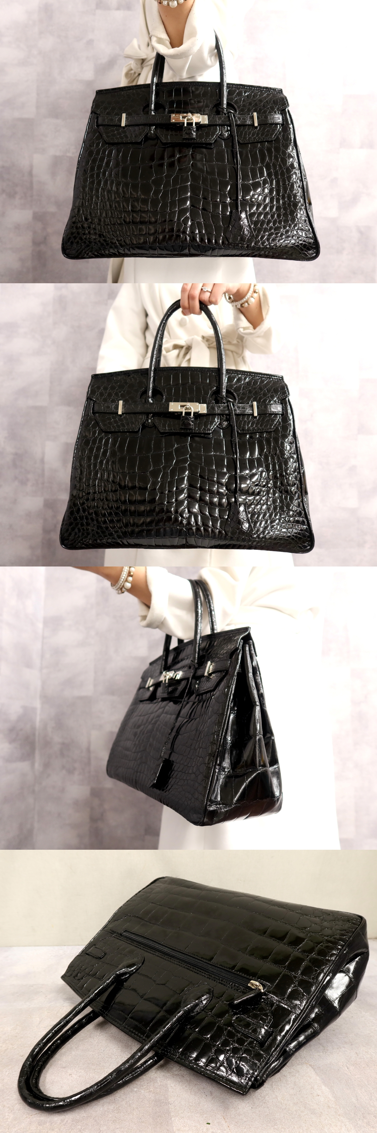 ●超美品●GENUINE●シャイニング クロコダイル 本 ワニ 革●ハンド バッグ●黒●シルバー金具●腕掛け●B5 書類 収納 かばん●Js66202 收藏