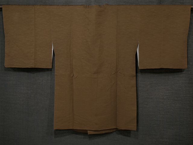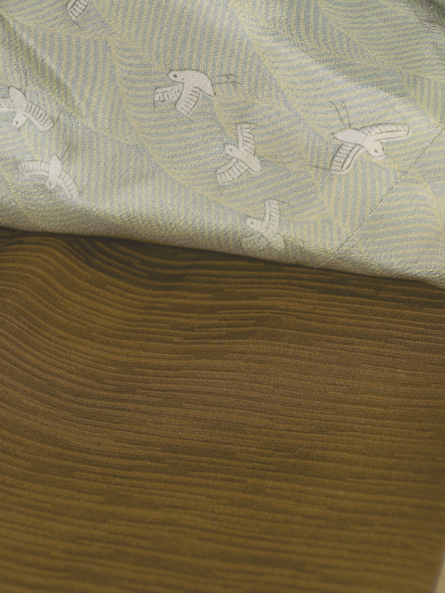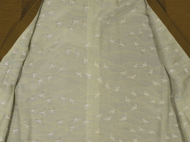 灰茶色の地に抽象的な地紋が織り出されている、色無地の駒綸子の道行コートです。袷仕立てです。 落ち着いたシックさの感じられる何げないお色目で、粋な風情も感じられます。波と鳥の文様が染められた肩裏も愛らしい印象で、素敵です。 ユーズド品と思われますが、目につくしみやよごれ、褪色などのダメージはなく、きれいな状態です。 |