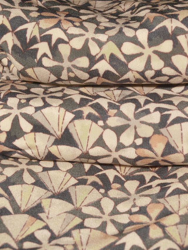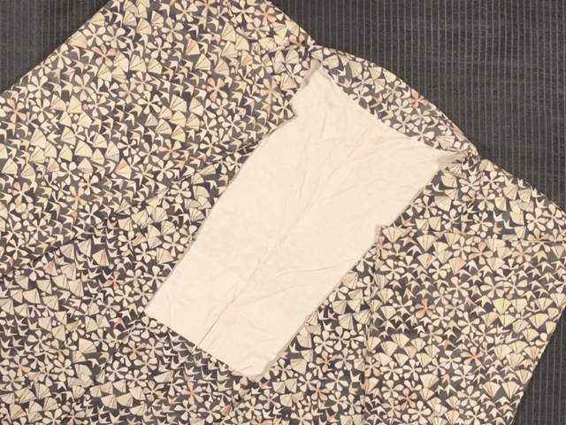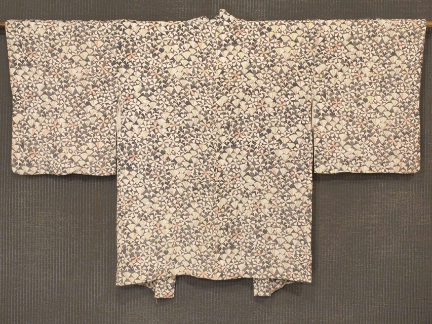 全体的な印象としては、濃淡のあるやや淡い黒緑色の地に、抽象的にあらわされた扇と草花の文様が染められている、縮緬の羽織です。袷仕立てです。 昭和初期ごろにつくられたと思われるアンティークのお品です。梅と笹のような草花と扇が抽象的にあらわされている点におもしろみとかわいらしさが感じられます。ややシャリ感のあるやわらかな手ざわりのシボのややこまかな縮緬地です。 羽裏に直径約 2-3mm のごくうっすらとした黄変が 2、3 か所、表地の全体のところどころに直径約 1-2mm のごくうっすらとした黄変が若干ありますが、いずれもほとんど判別はつかず、気にはなりません。そのほかに目につく大きなしみやよごれ、褪色などのダメージはなく、この時代のものとしてはきれいな状態です。 |