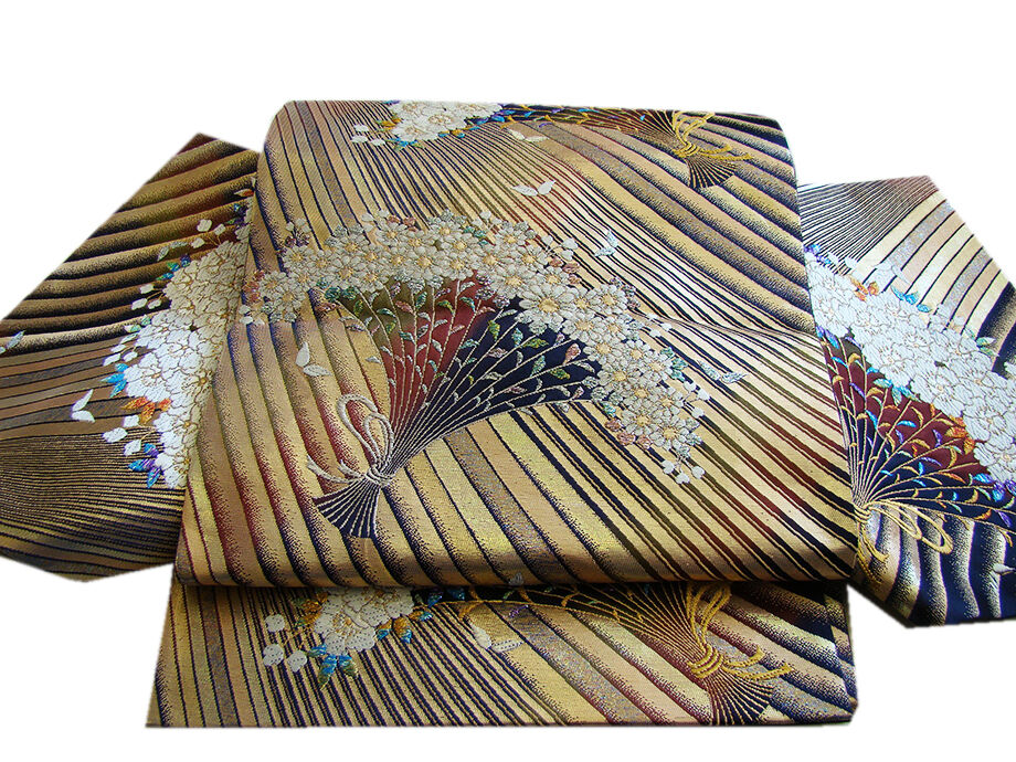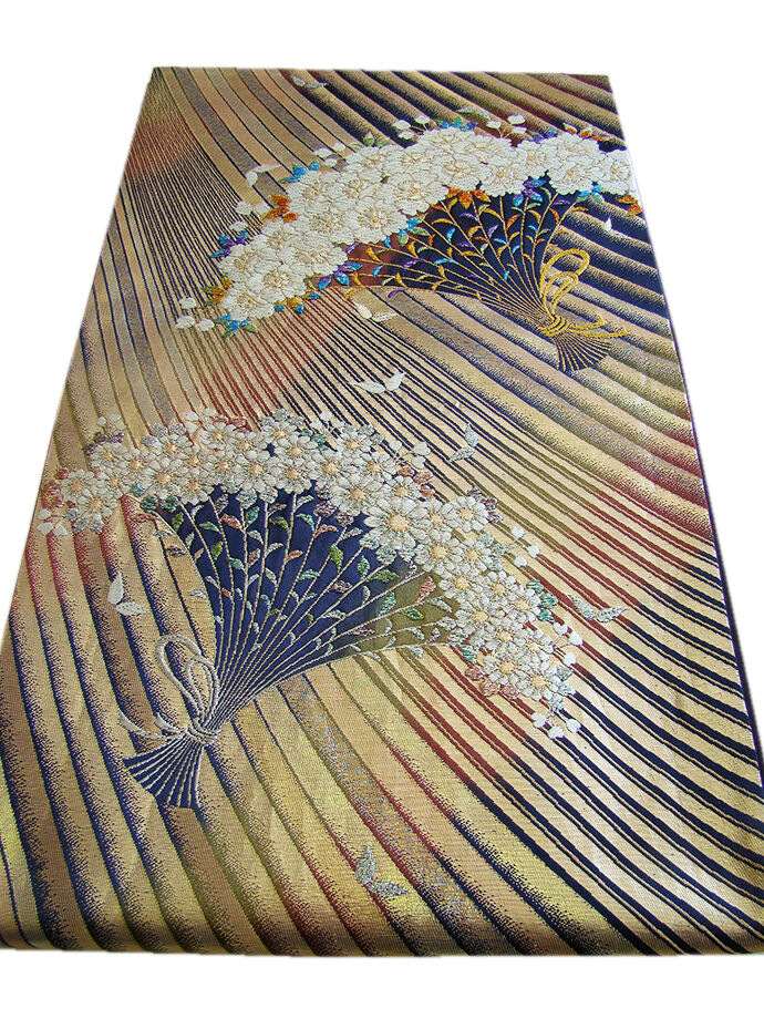 | 商品説明 | とてもしなやかで扱い易く〆易い重厚感溢れる西陣織の袋帯。 豪華な金糸、白、水色等の斜線に花束文の織柄。 六通柄。 |