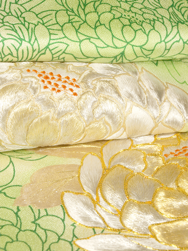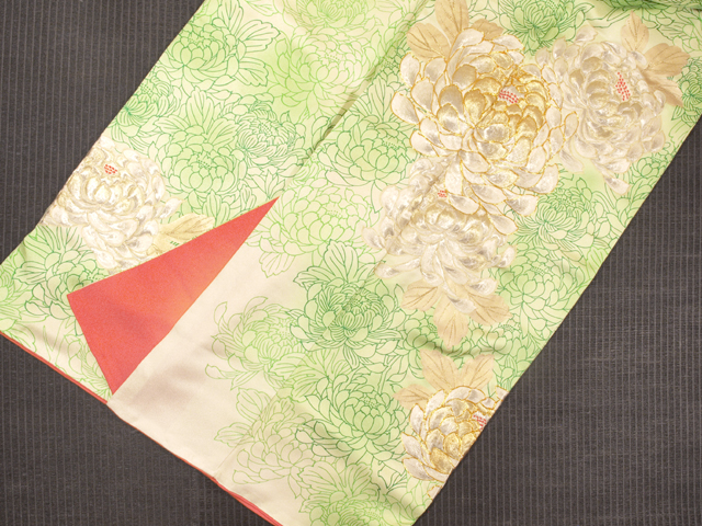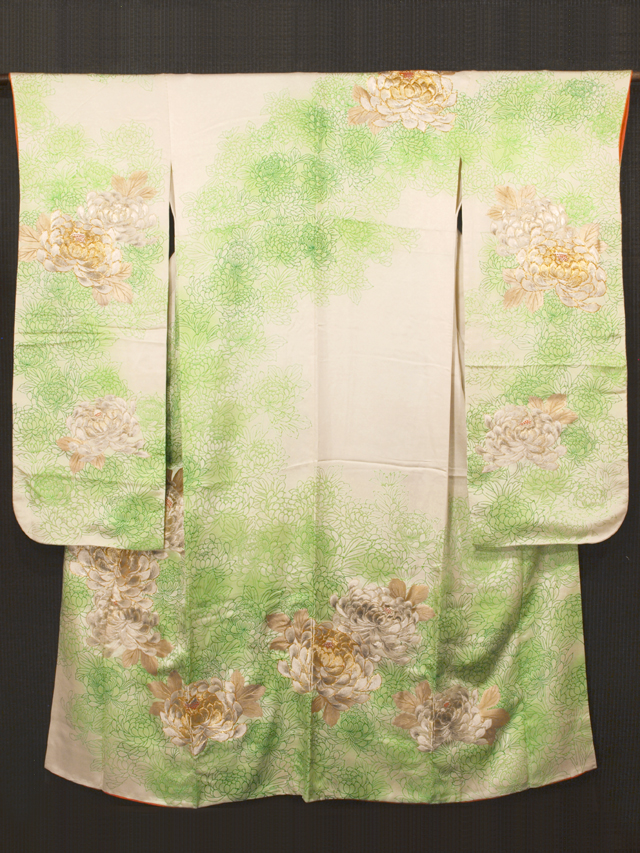 全体的な印象としては、きなりがかった白色の地に、こまかな霜降りの地紋が織り出され、淡い萌黄(もえぎ)色のぼかしと菊の文様が染められている、紋綸子縮緬の振袖です。ところどころに金糸と銀糸の刺繍で大菊の文様が施されています。袷仕立てです。着物専門店「やまと」さんで販売されたお品で、右衿先裏にタグが縫い付いています。 ふんだんに刺された厚くぼってりとした刺繍がとても豪奢な雰囲気で、アンティークな趣も感じさせる大ぶりの意匠が華やぎを醸しています。とてもやわらかでなめらかな上質の縮緬地です。 ユーズド品で、右前袖の袖山下に直径約 2mm の金彩うつりが 1 か所、左前袖の中央上の刺繍の上に直径約 2cm のうっすらとした金彩うつりが 1 か所ありますが、いずれもあまり目にはつかず、気にはならなさそうです。そのほかに目につくしみやよごれ、褪色などのダメージはなく、全体的にはきれいな状態です。 |