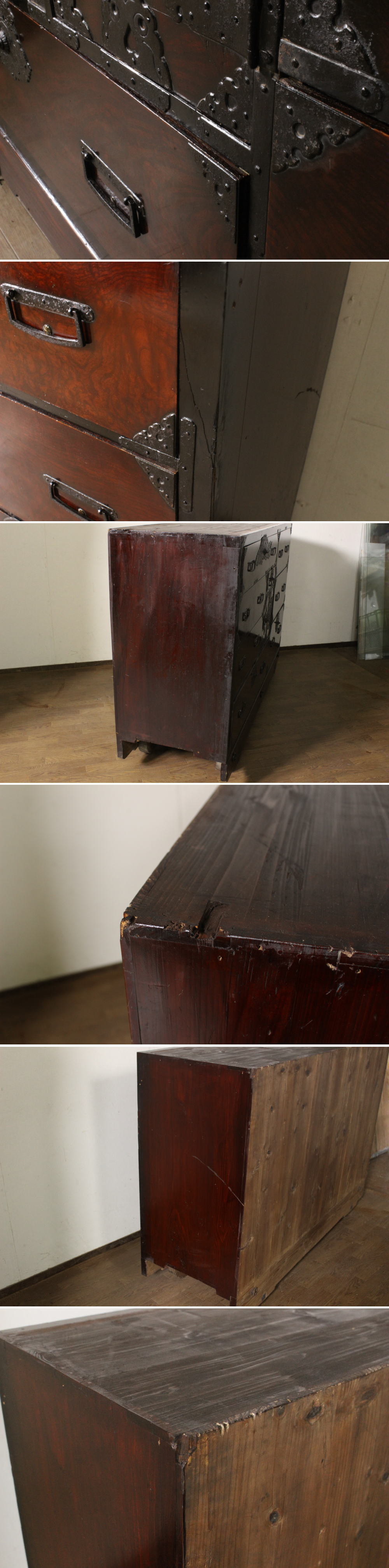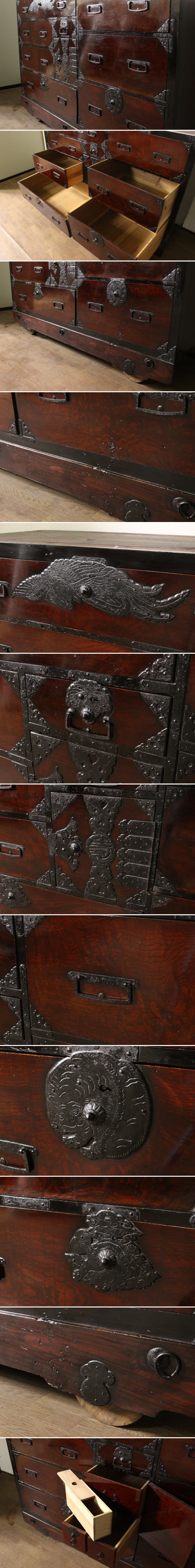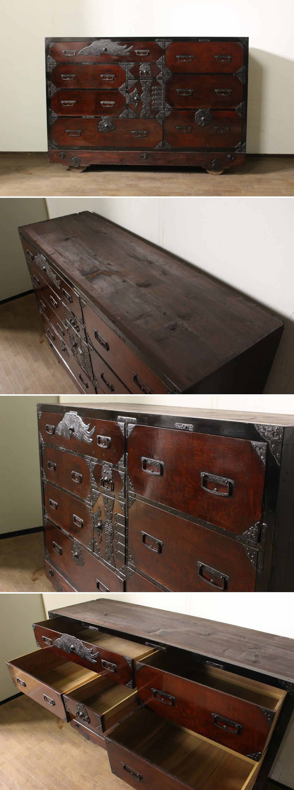 明治時代からある茅葺き屋根の旧家から入手いたしました。 家屋の収納部にはめこまれ大事に使用されていたもので、 今では希少な箪笥のひとつになるのではないでしょうか。 引き出し前板は、鮮やかな杢模様の欅無垢材、 錠金具には鳳凰や唐獅子があしらわれており、 シンプルながらも重厚な角手型の引手金具も素敵です。 引き出しは大小11杯、扉内には隠し箱もついています。 下部には車付き、傷みがちな車輪には欅材、 傷みや腐りもなく、大変しっかりしています。 引取時は地震対策の為、家屋にビス止めにて固定されていました。 その際、多少の手直しや補強をされたそうです。 本来は左中段、右上中段などは棒がついていたようですが、 欠損しており、引き出しが前に出されています、 今では貴重なアイテムになってきている100年以上前の時代箪笥。 和のアイテムとして勿論、モダンな洋のインテリアとしてもオススメ、 レトロ・アンティークな雰囲気作りにご活用下さい。 |