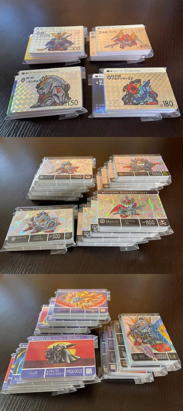 全てのカードがバインダーに封入されていましたが、全て取り出して各弾ごとにパックしなおしています。また経年劣化でワールドと外伝でよく見かけるバインダーの粘着面剥がれ(リフィル部分が剥がれてとれてしまう)があった形跡があるバインダーも含まれていますが、接着剤でつけ直してた跡があります。カードはほぼ未使用レベルだと思います。新規カードは欠品しています。ナイトガンダム物語、黄金神話の各弾の2重キラは全て未剥がしがあり、リバースプリズムが計24枚別途ごさいます。ジャンボカードは剥がした形跡があります。バインダーには多少なりとも擦れ等の傷みがあります。