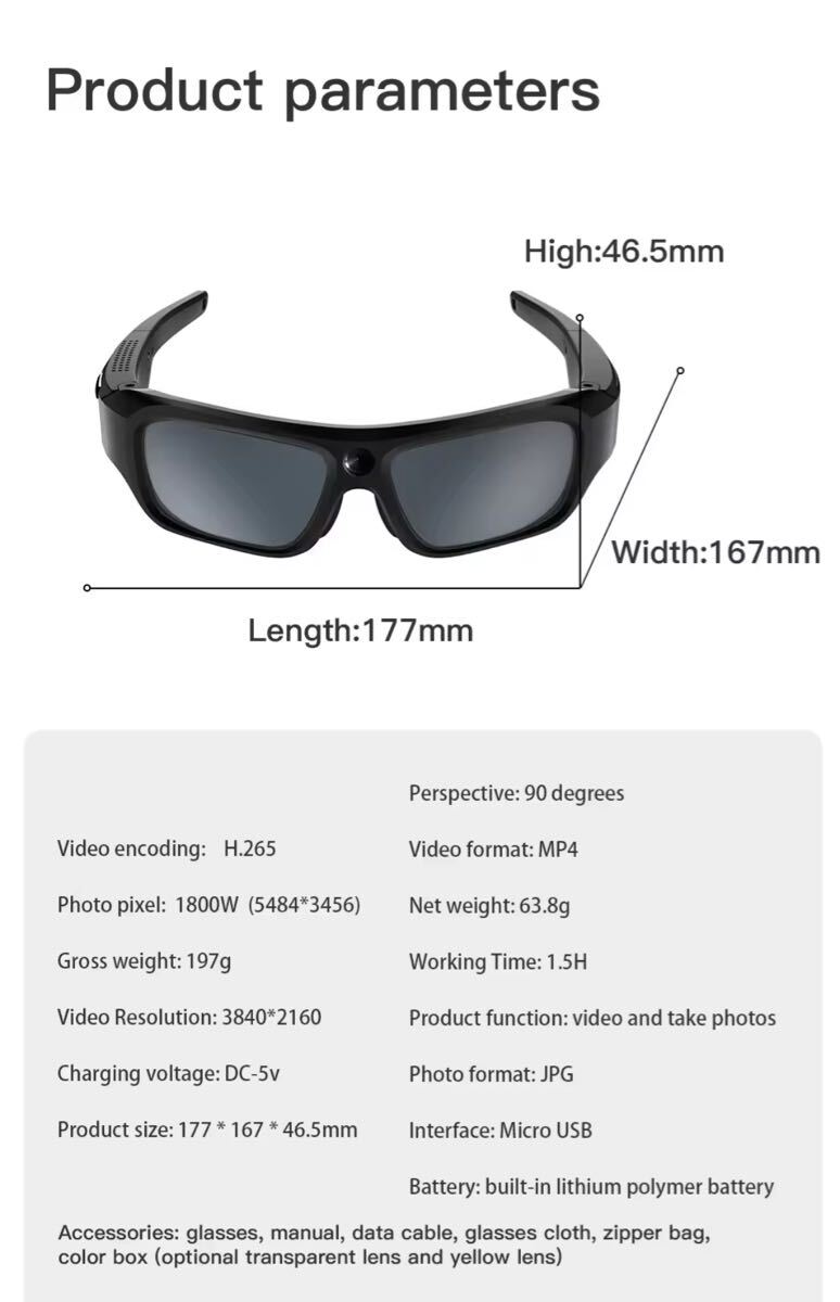 メガネ型4Kアクションカメラ・動作確認のみ・サングラスレンズ交換可能 ウェアラブルカメラ 最大256G SD対応 收藏