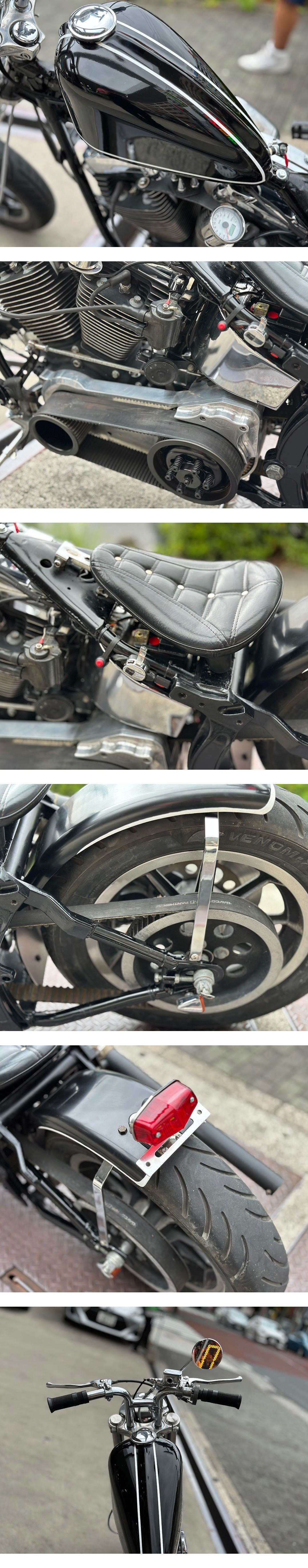 前後ホイールは人気ビンテージパーツなAMF純正ナインキャストホイールに換装、センターリブスポーツタンクにナローなライザーハンドルでゴリゴリのフリスコスタイルセットアップとなっております。