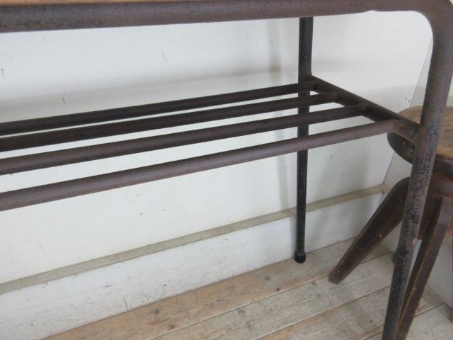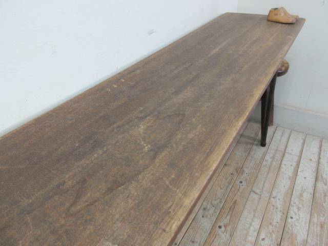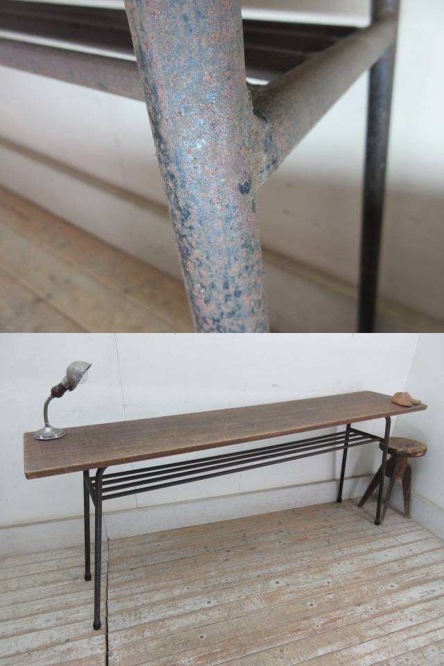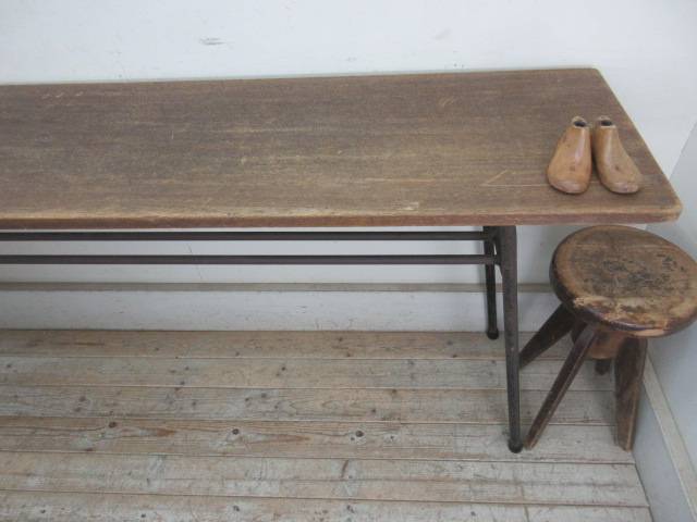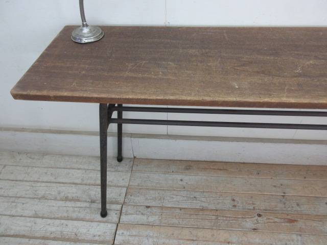 古い木味の鉄脚横長テーブルK811 アンティーク家具作業台デスクカウンターダイニングテーブルレジ台店舗什器カフェ什器無垢材古家具 收藏