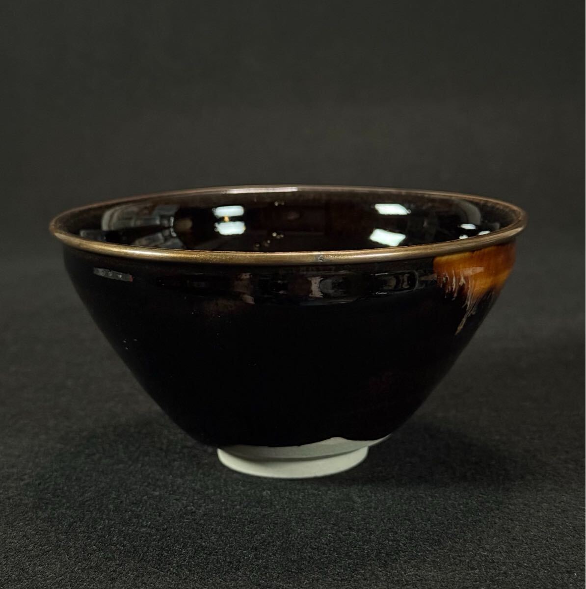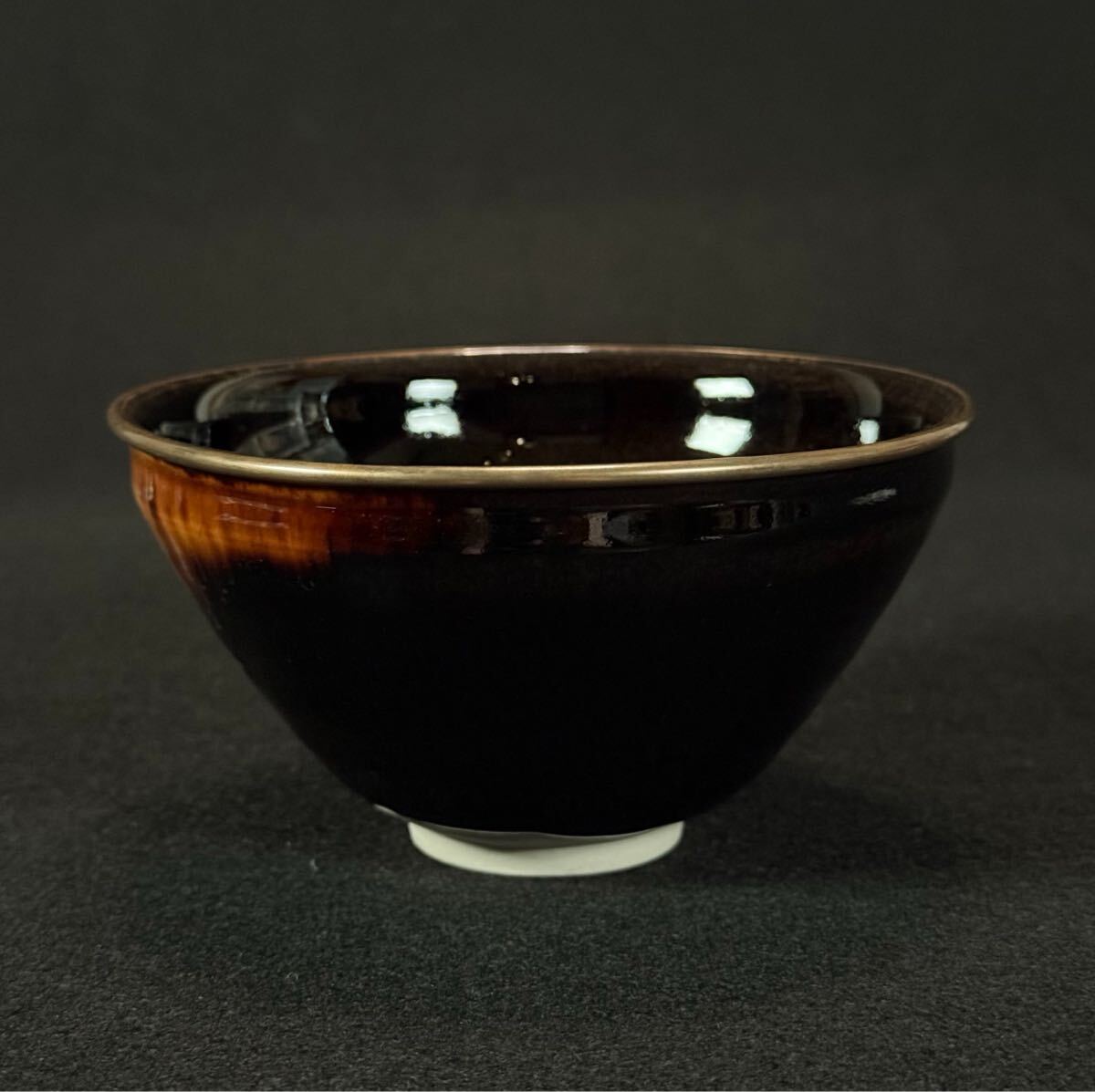 ● 天目釉を得意とする「桶谷定一」作、共箱です。釉薬の流れが美しい茶碗です。高台に作者「定」の彫銘があります。